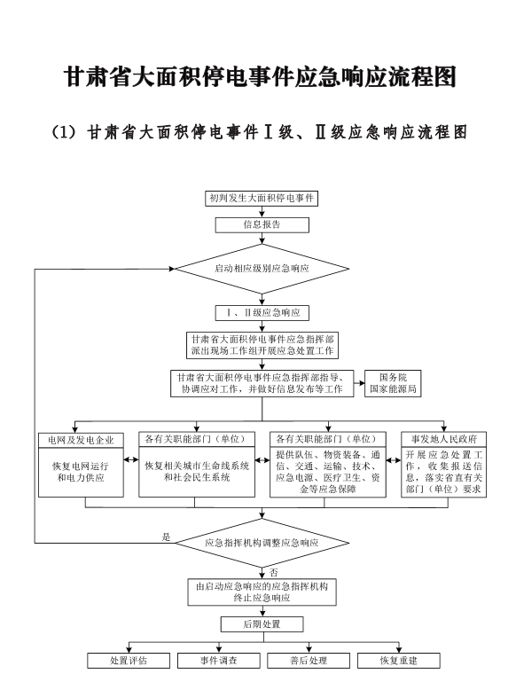 国家能源局甘肃监管办:负责配合开展大面积停电事件应急处置工作;配合做好新闻宣传工作;接到大面积停电事件报告后,立即核实有关情况并向国家能源局报告,同时通报事发地县级以上地方人民政府。