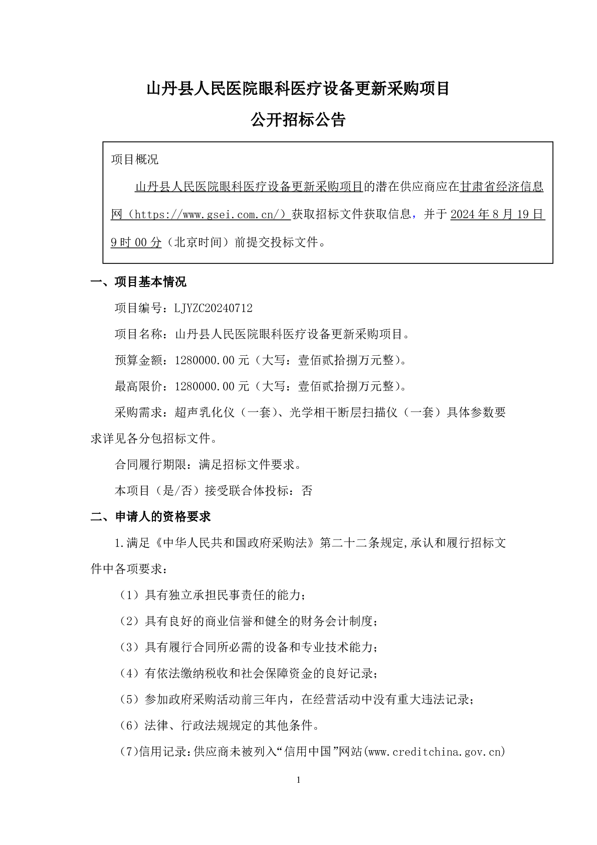 山丹县人民医院眼科医疗设备更新采购项目公开招标公告