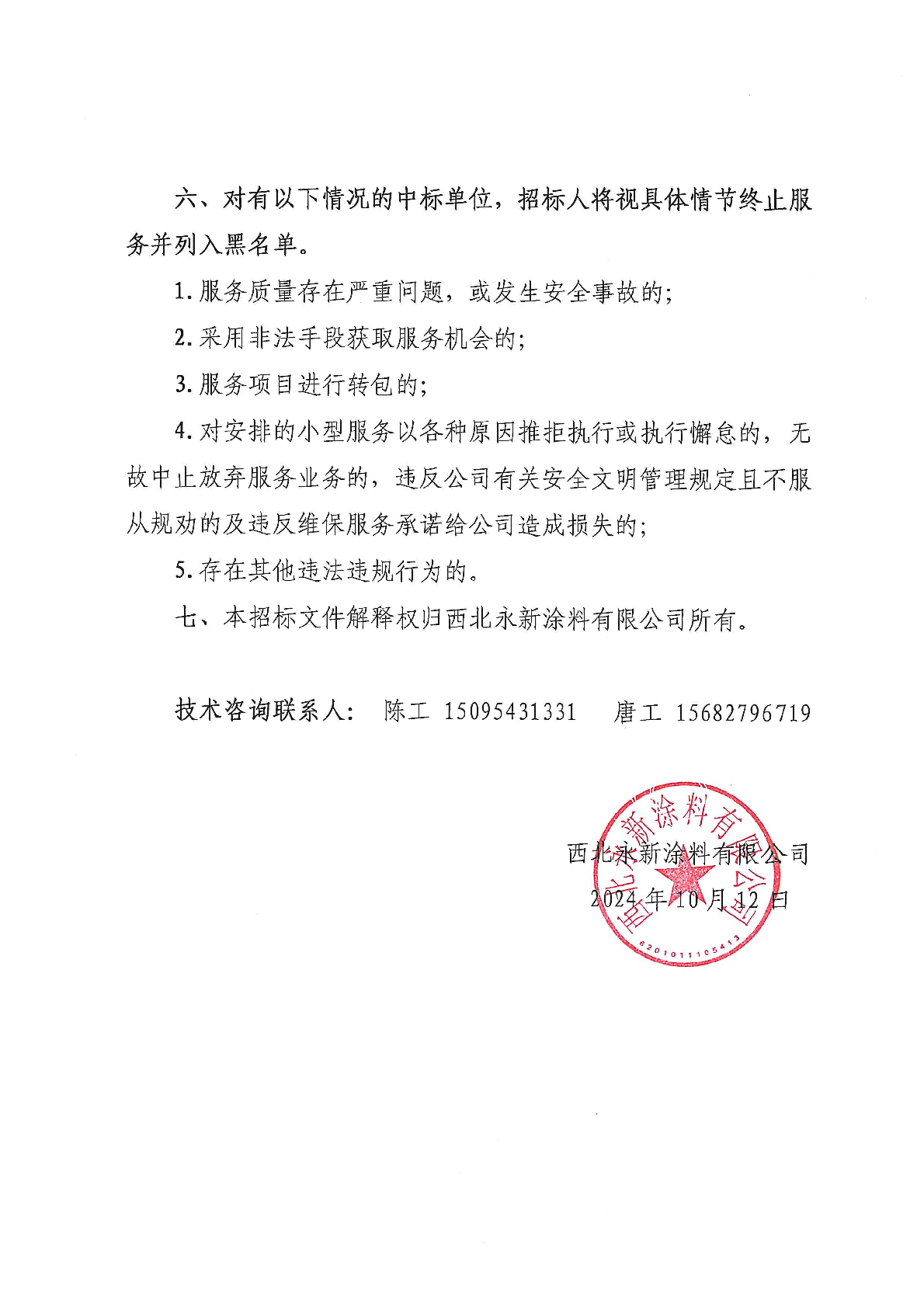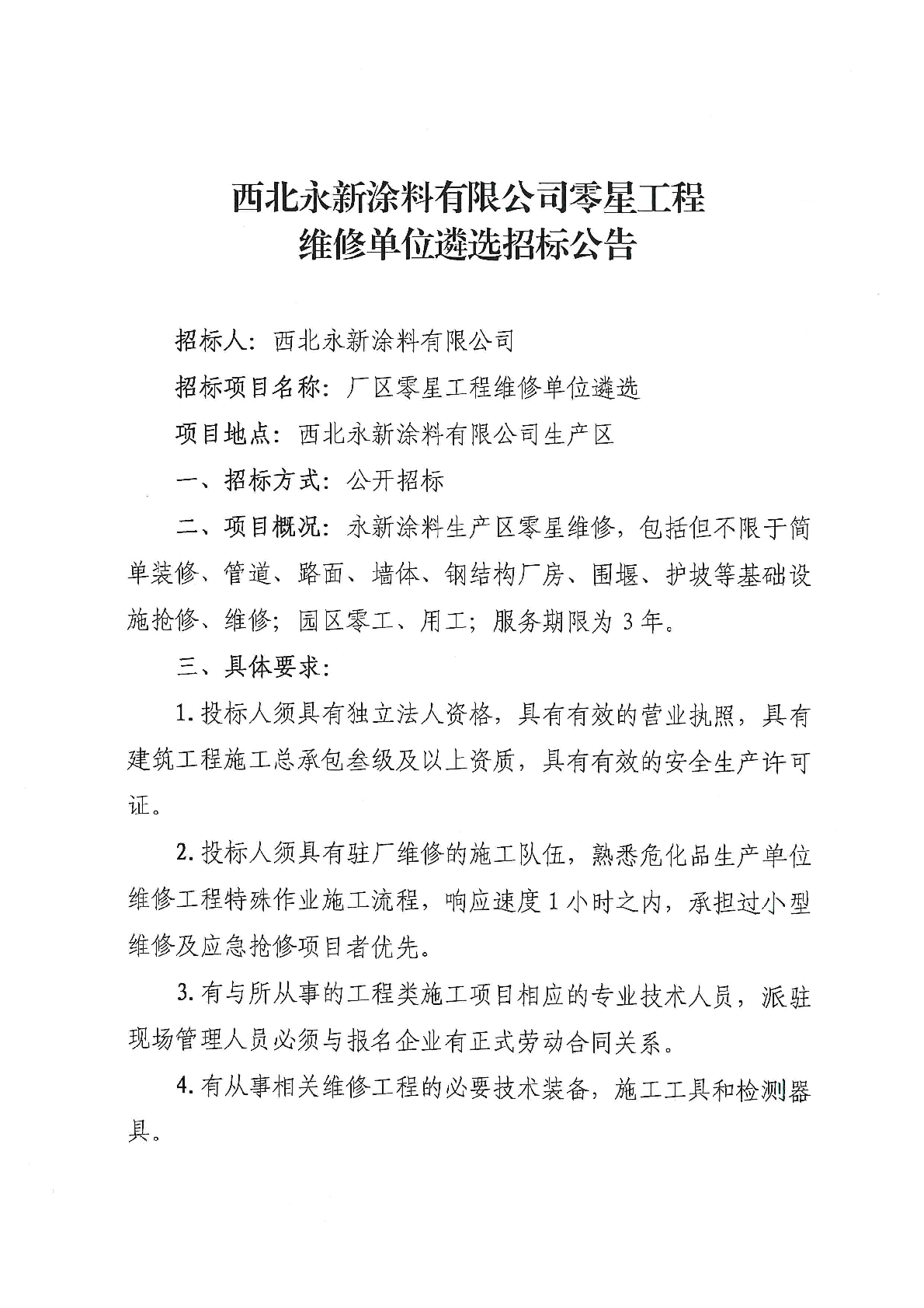 西北永新涂料有限公司零星工程维修单位遴选招标公告