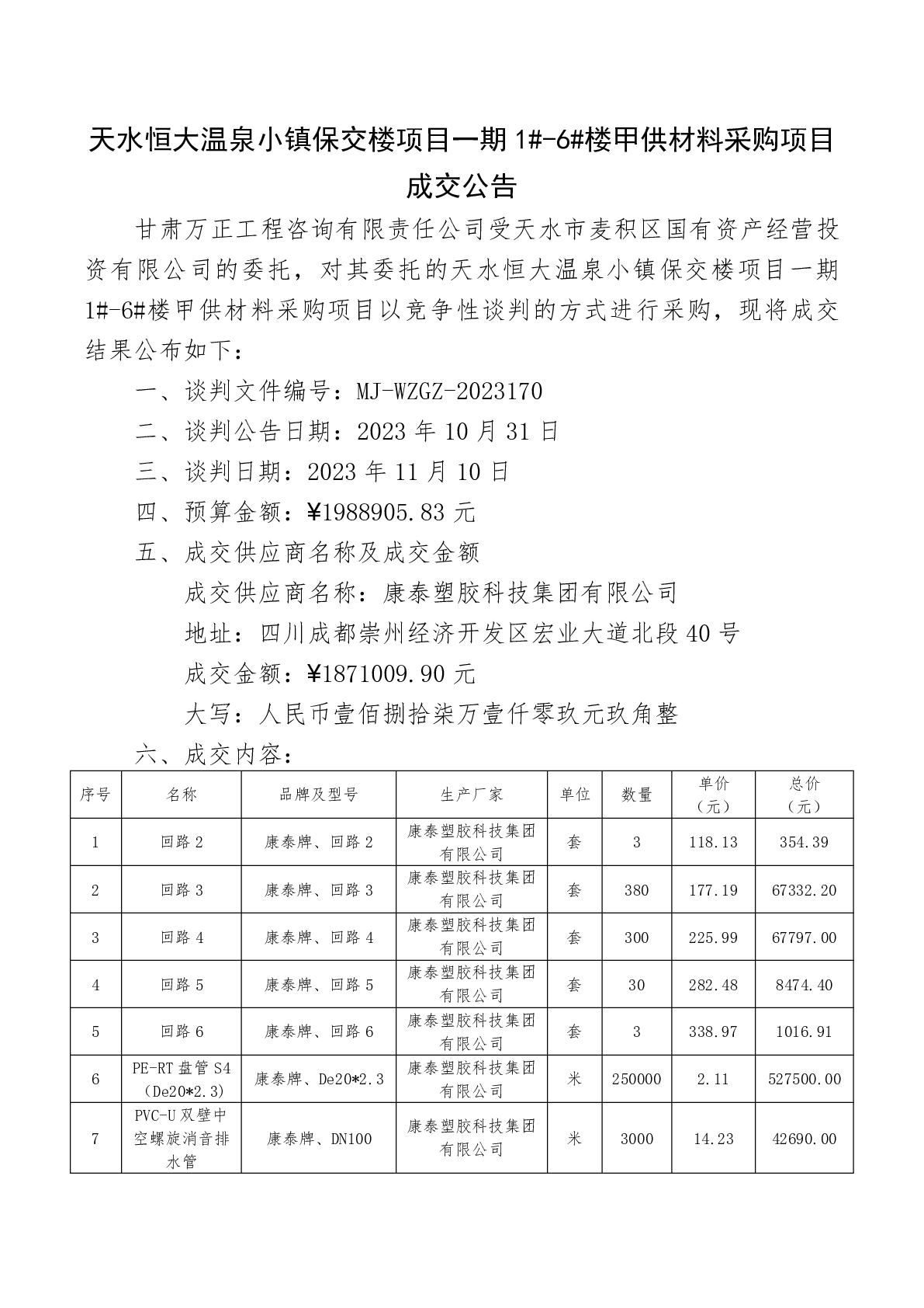 天水恒大温泉小镇保交楼项目一期1#-6#楼甲供材料采购项目成交公告