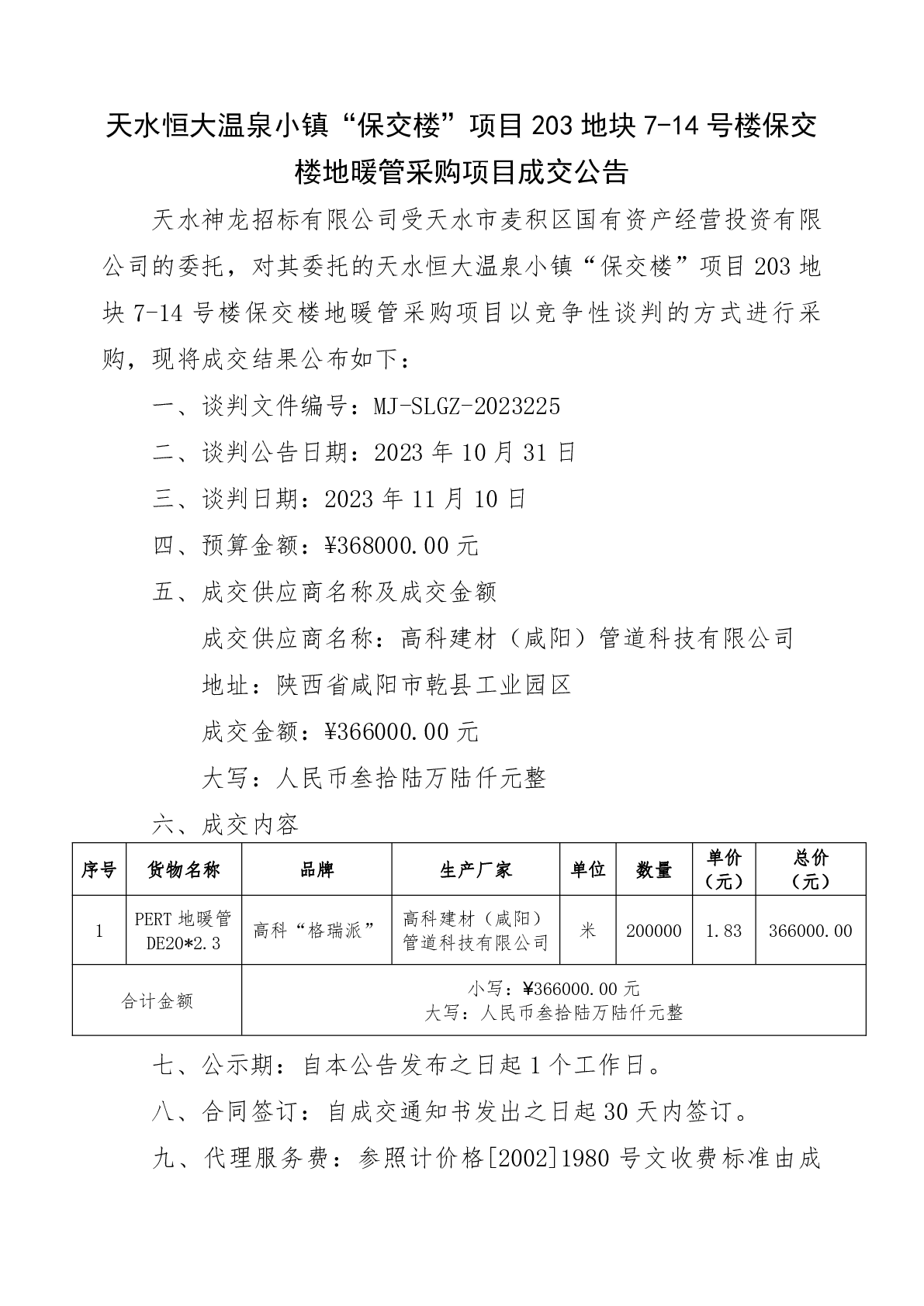 天水恒大温泉小镇“保交楼”项目203地块7-14号楼保交楼地暖管采购项目成交公告
