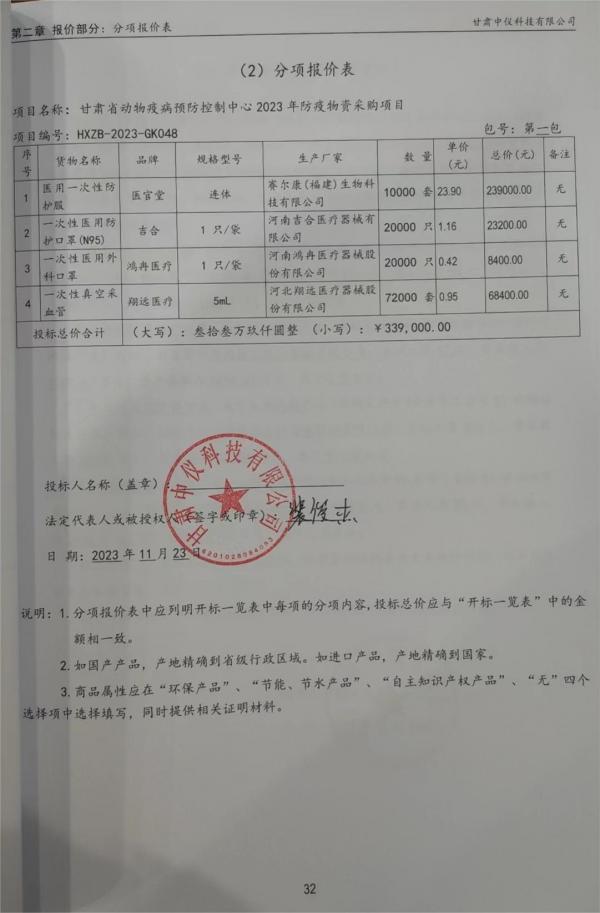 甘肃省动物疫病预防控制中心2023年防疫物资采购项目中标公告