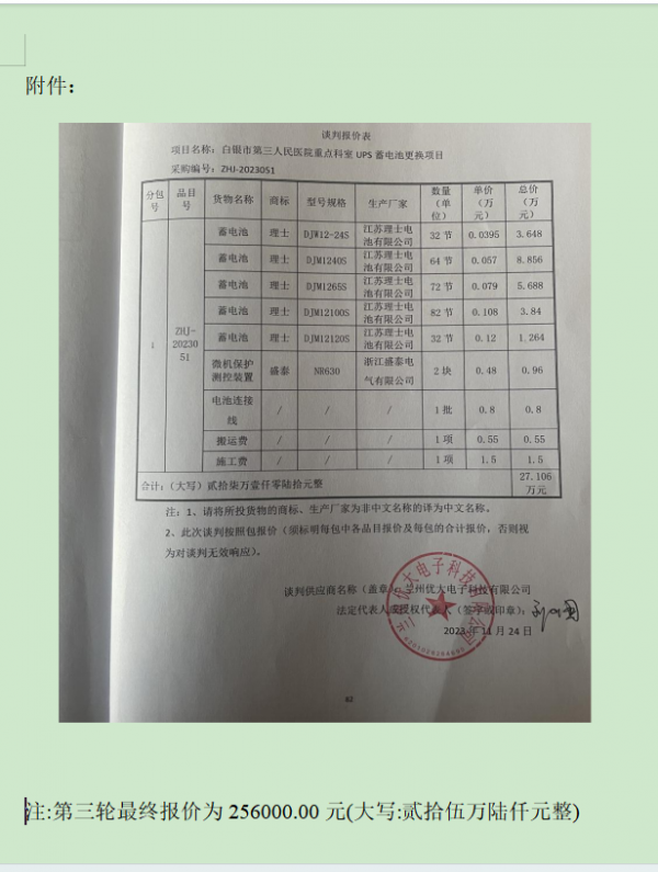 名称:白银市第三人民医院重点科室UPS蓄电池更换项目 品牌:详见附件 型号:详见附件 单价:详见附件 |