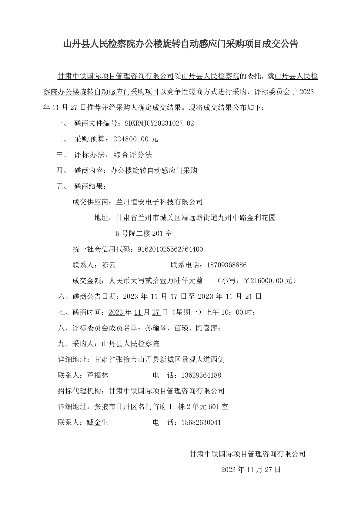 山丹县人民检察院办公楼旋转自动感应门采购项目成交公告