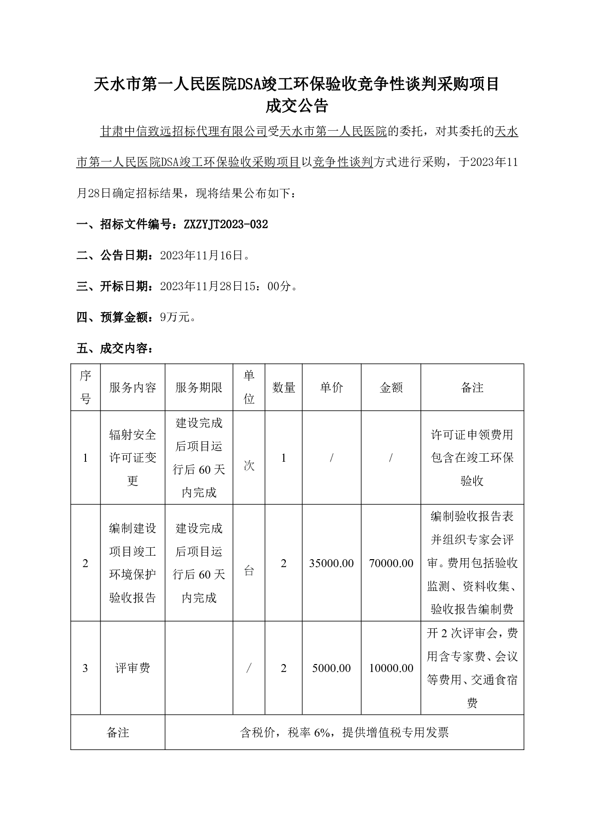 天水市第一人民医院DSA竣工环保验收竞争性谈判采购项目成交公告