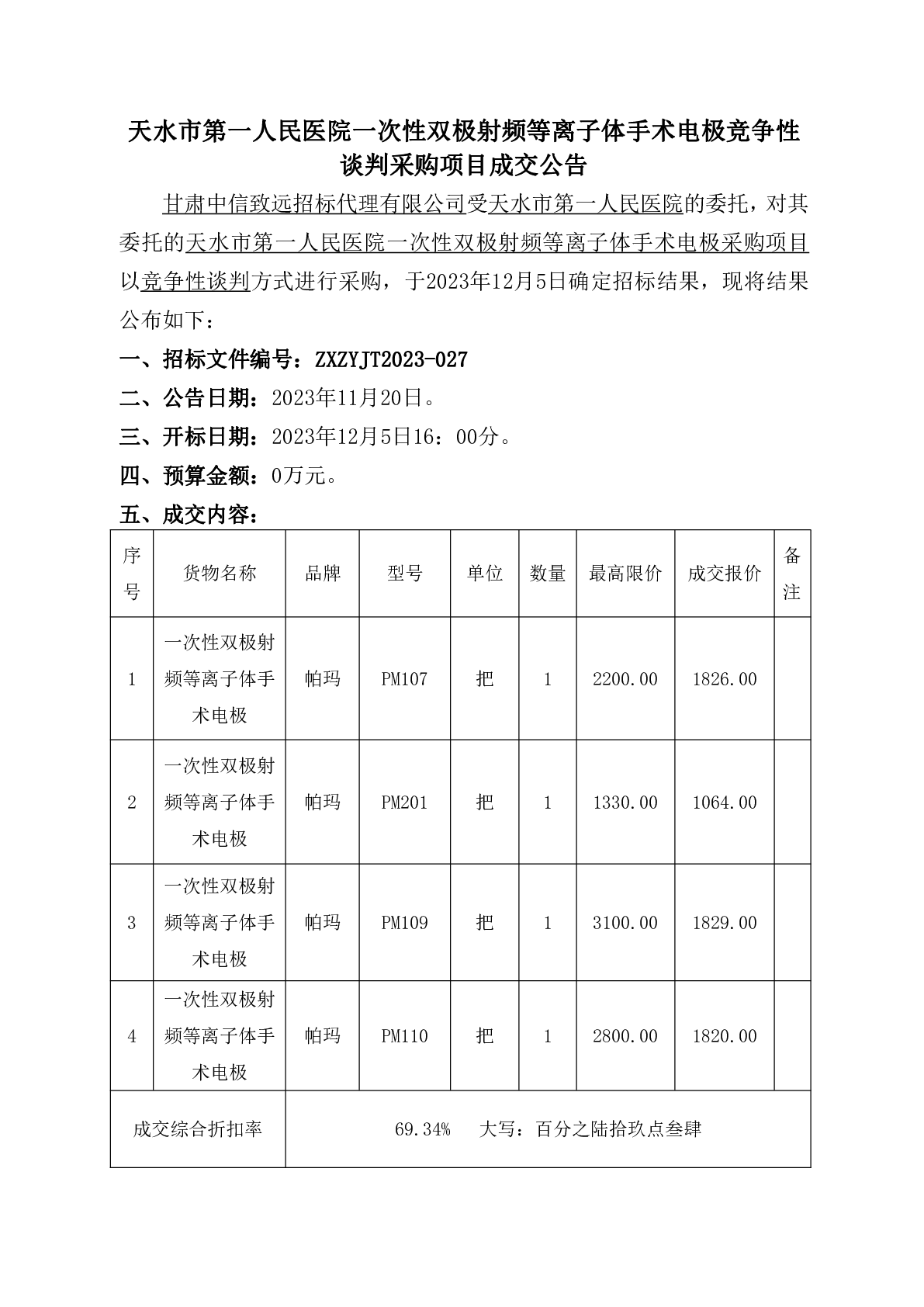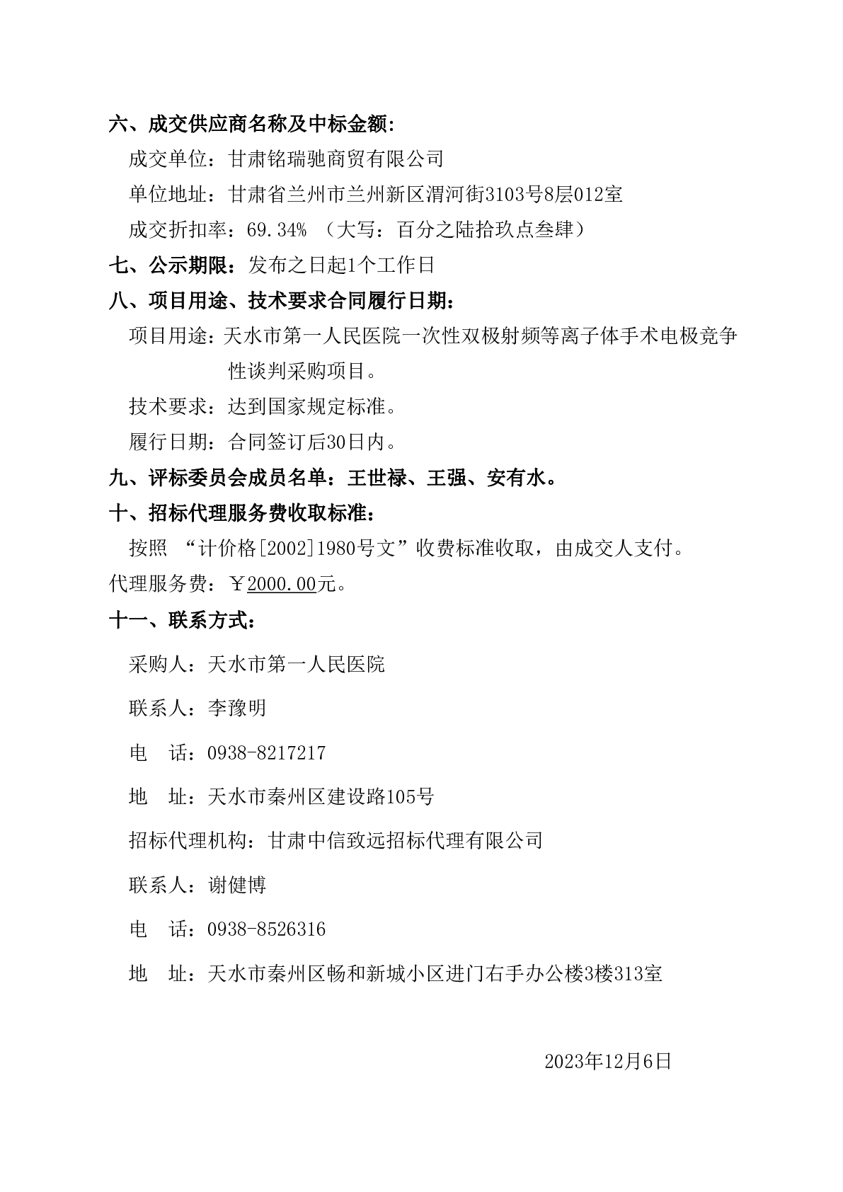 天水市第一人民医院一次性双极射频等离子体手术电极竞争性谈判采购项目成交公告