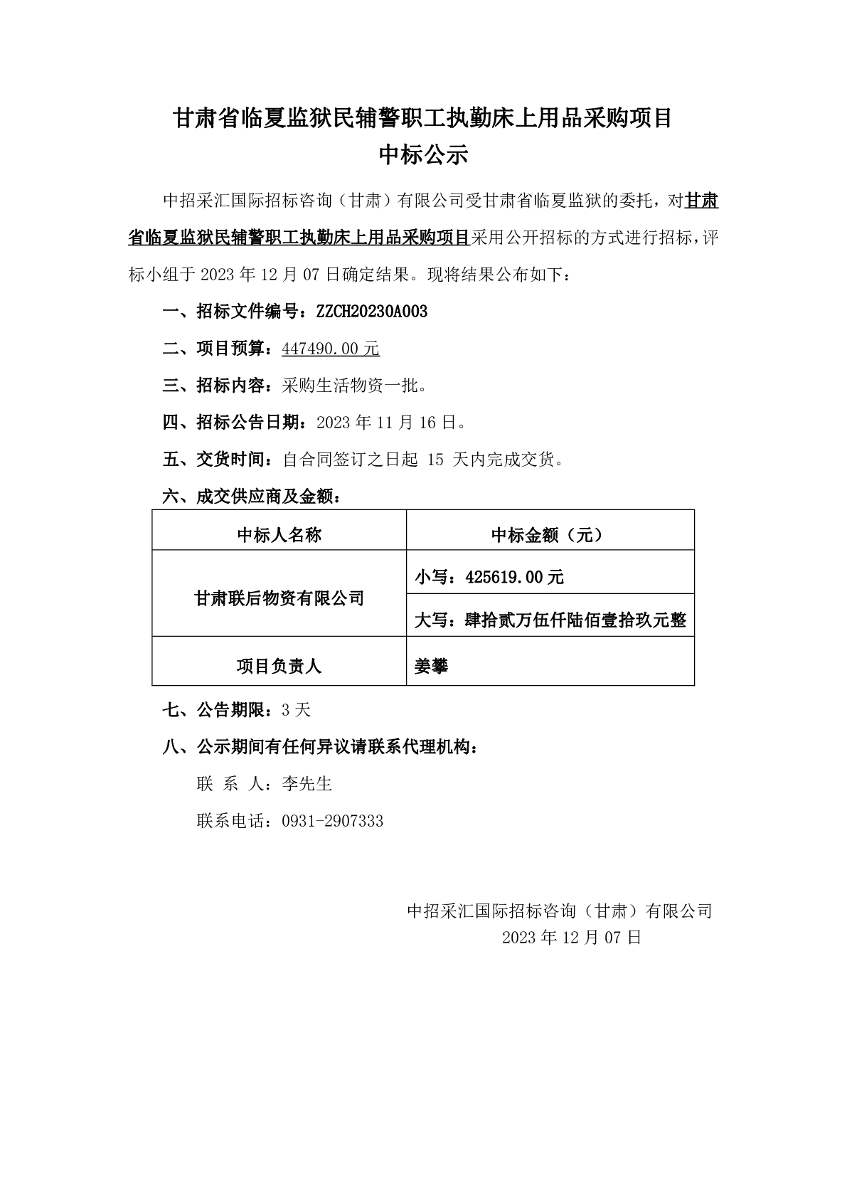 甘肃省临夏监狱民辅警职工执勤床上用品采购项目中标公示