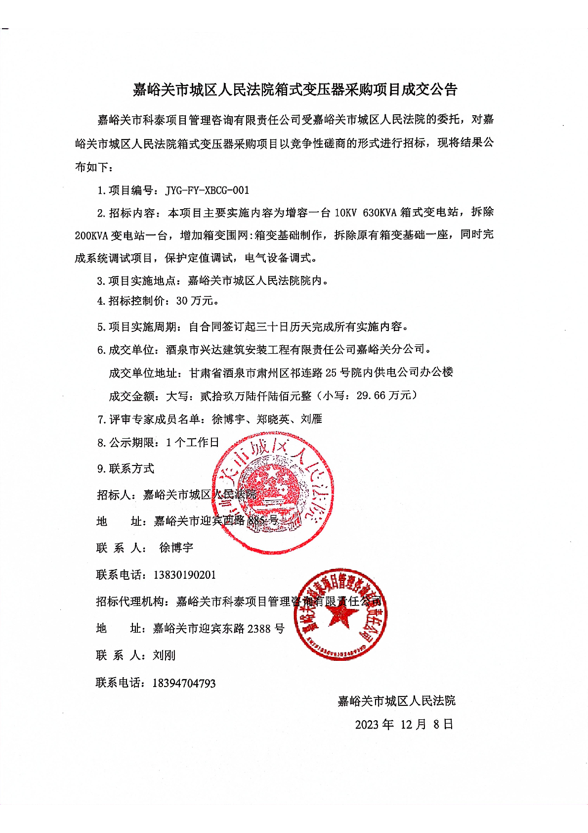 嘉峪关市城区人民法院箱式变压器采购项目成交公告