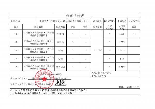 甘肃省人民医院东院区12号楼维修改造项目设计成交公告