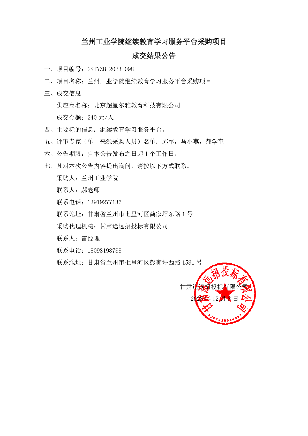 兰州工业学院继续教育学习服务平台采购项目成交结果公告