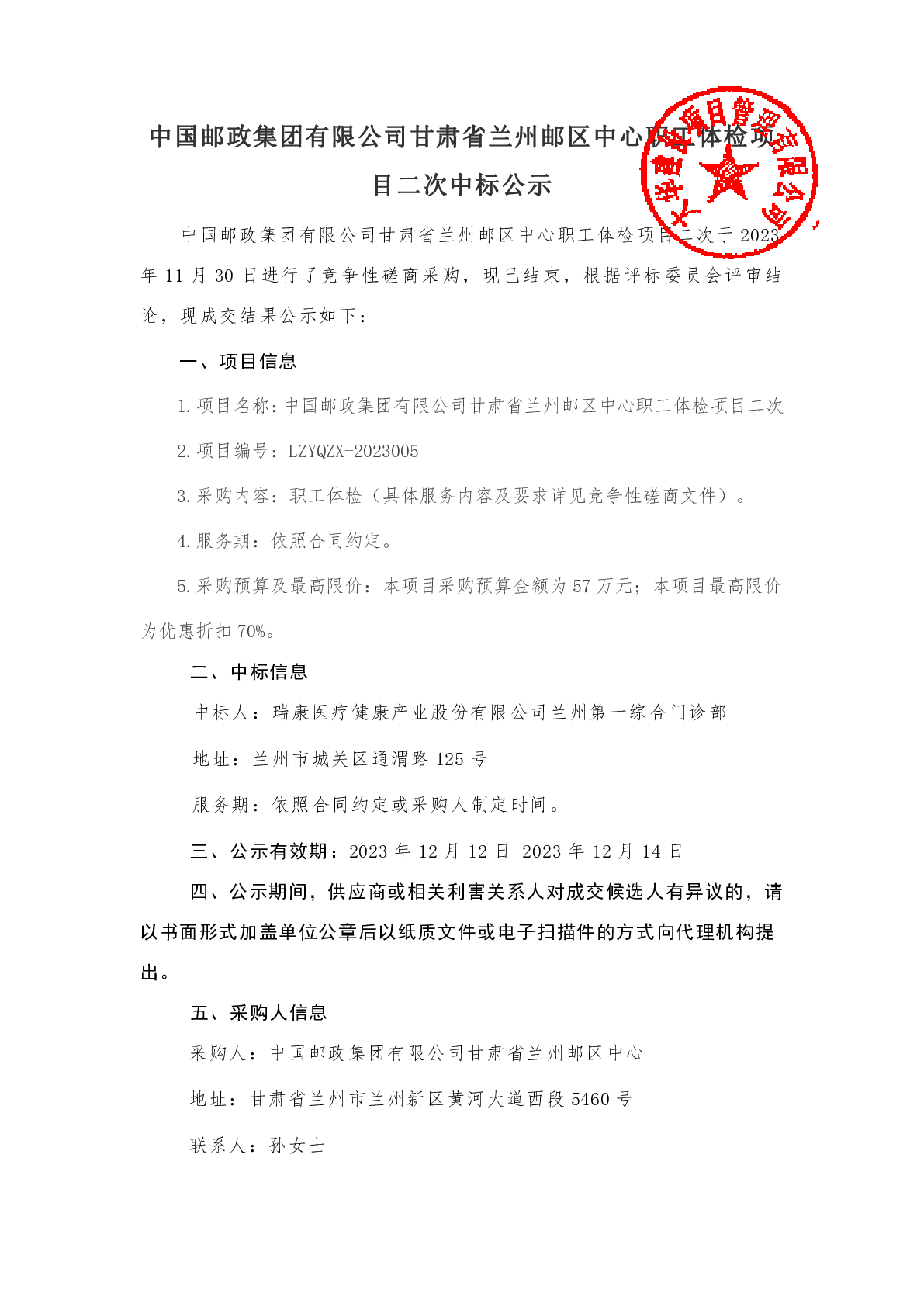 中国邮政集团有限公司甘肃省兰州邮区中心职工体检项目二次中标公示