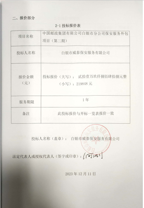 二、项目名称:中国邮政集团有限公司白银市分公司保安服务外包项目(第二期)