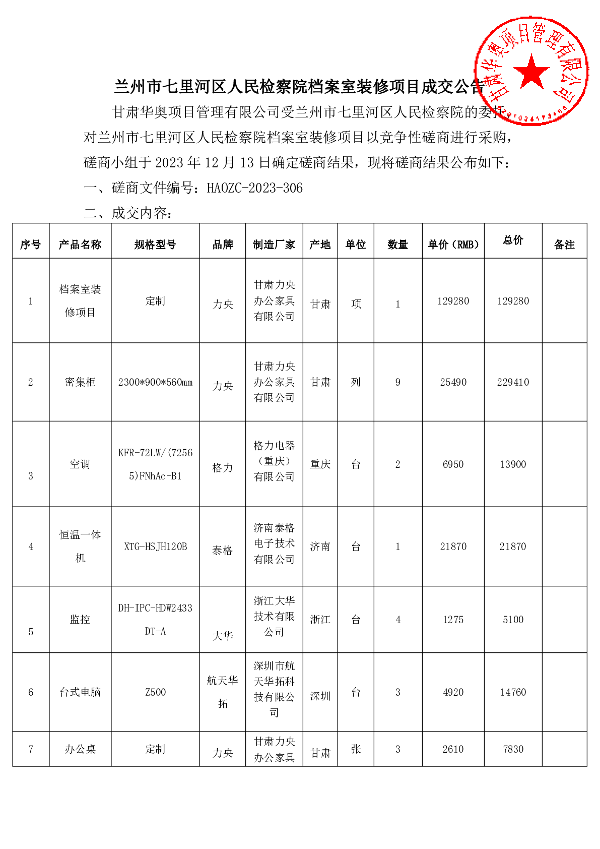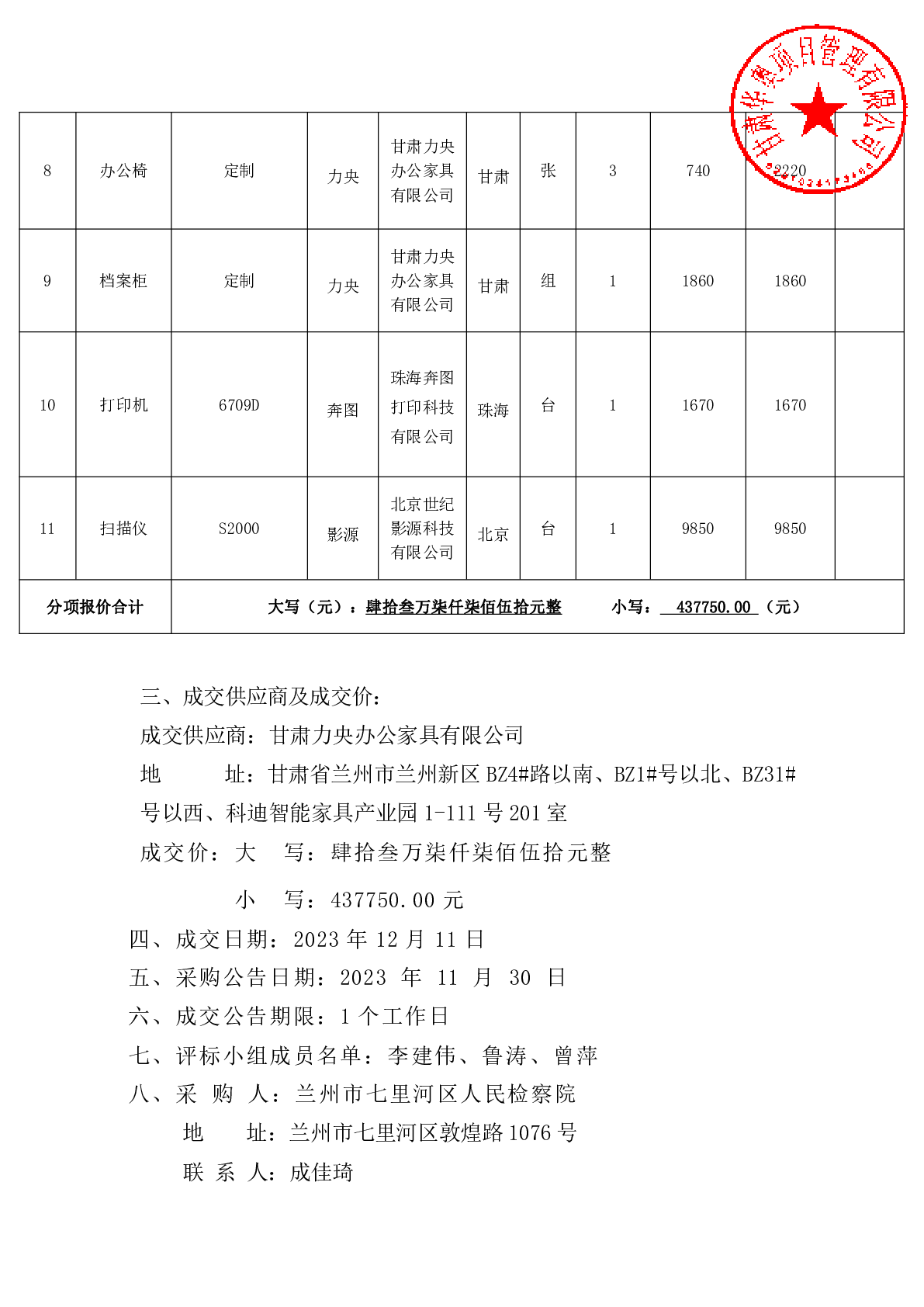 兰州市七里河区人民检察院档案室装修项目成交公告