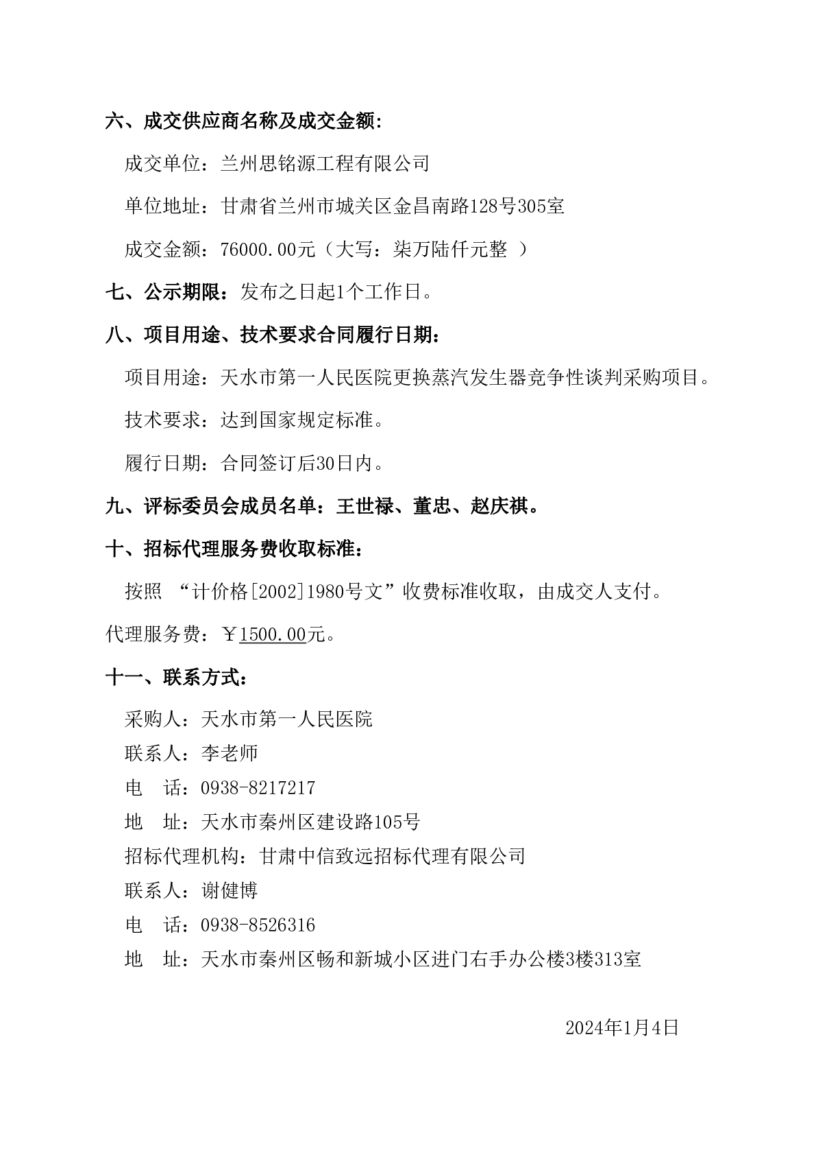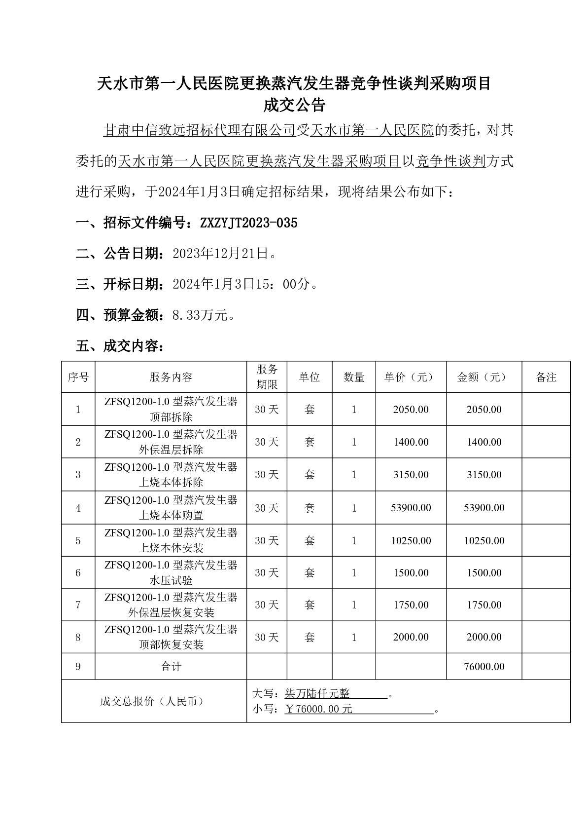 天水市第一人民医院更换蒸汽发生器竞争性谈判采购项目成交公告