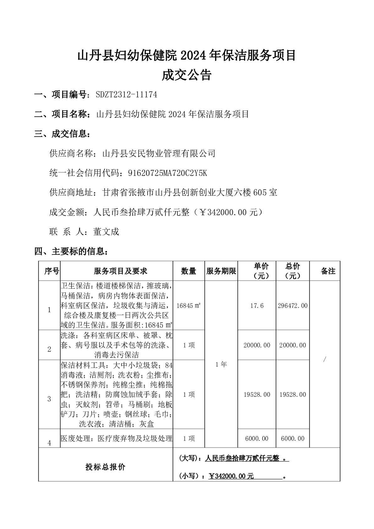 山丹县妇幼保健院2024年保洁服务项目成交公告