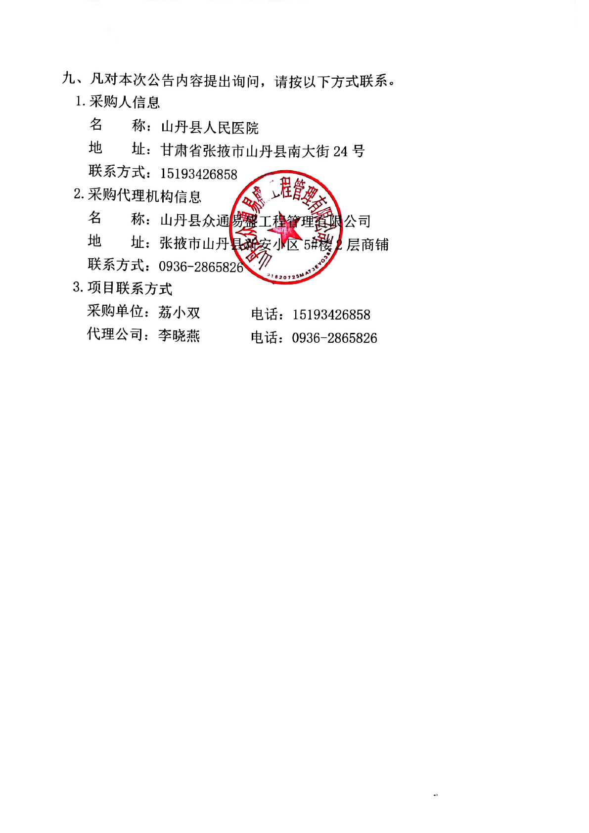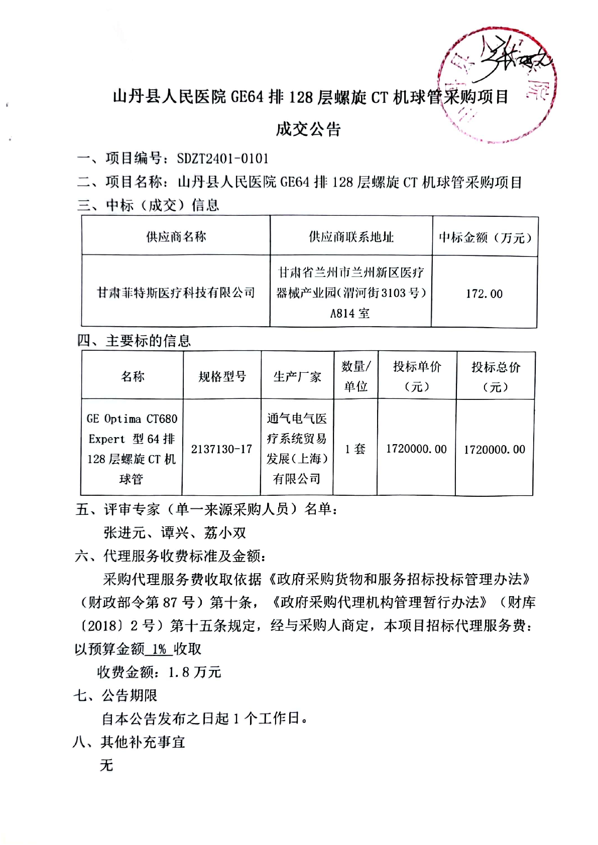 山丹县人民医院GE64排128层螺旋CT机球管采购项目单一来源成交公告