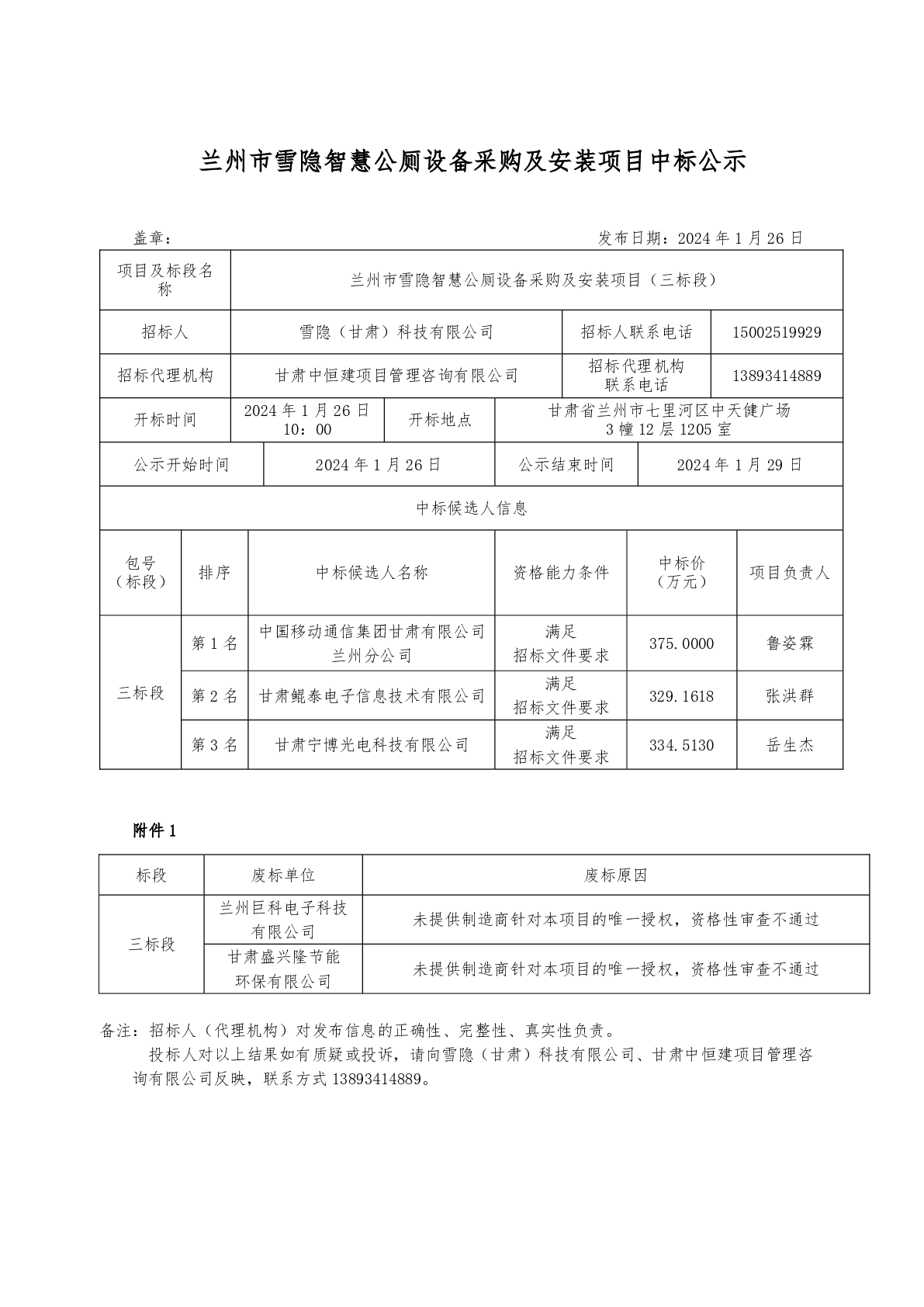 兰州市雪隐智慧公厕设备采购及安装项目中标公示