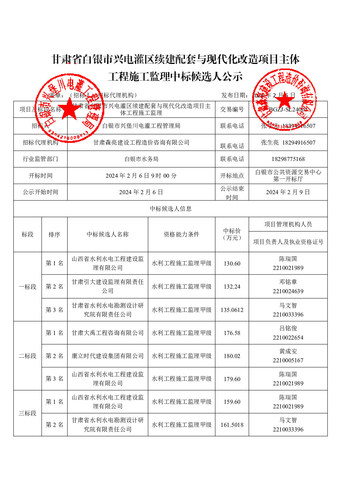 甘肃省白银市兴电灌区续建配套与现代化改造项目主体工程施工监理中标公示