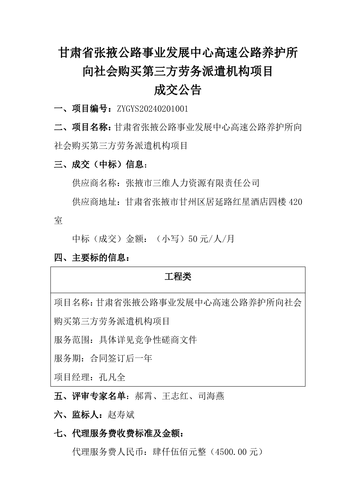 甘肃省张掖公路事业发展中心高速公路养护所向社会购买第三方劳务派遣机构项目成交公告
