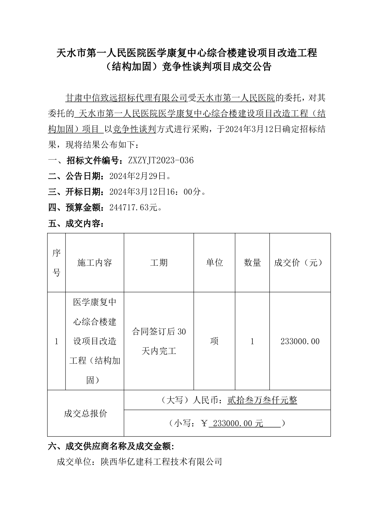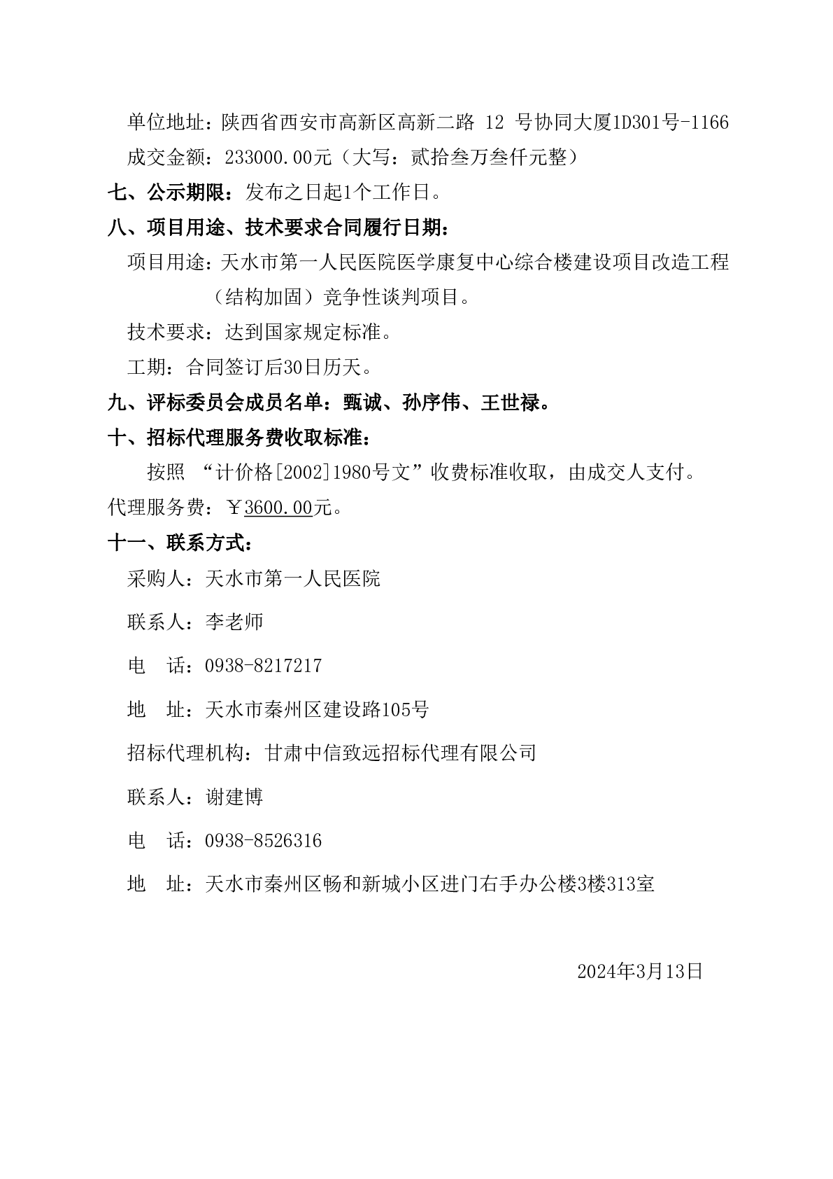 天水市第一人民医院医学康复中心综合楼建设项目改造工程(结构加固)竞争性谈判项目成交公告