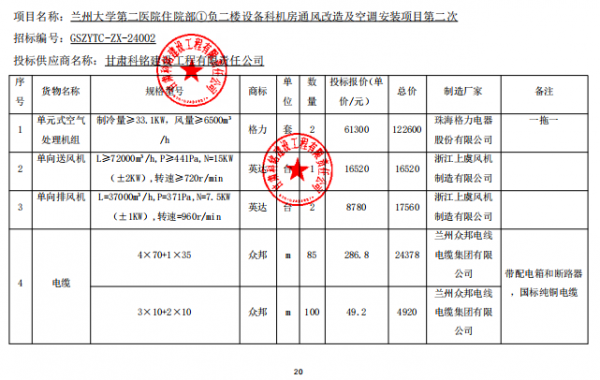 甘肃中远天成项目管理咨询有限公司受兰州大学第二医院的委托,对兰州大学第二医院住院部①负二楼设备科机房通风改造及空调安装项目第二次以公开招标方式进行采购,评标委员会于2024年03月20日确定中标结果,现将结果公布如下: