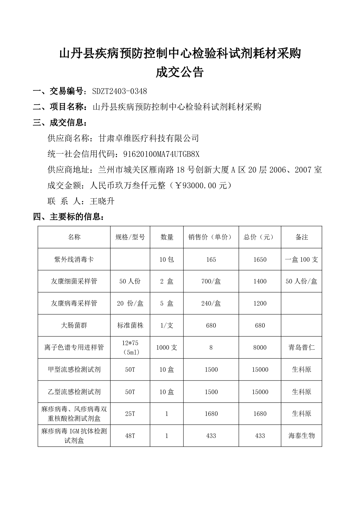 山丹县疾病预防控制中心检验科试剂耗材采购成交公告