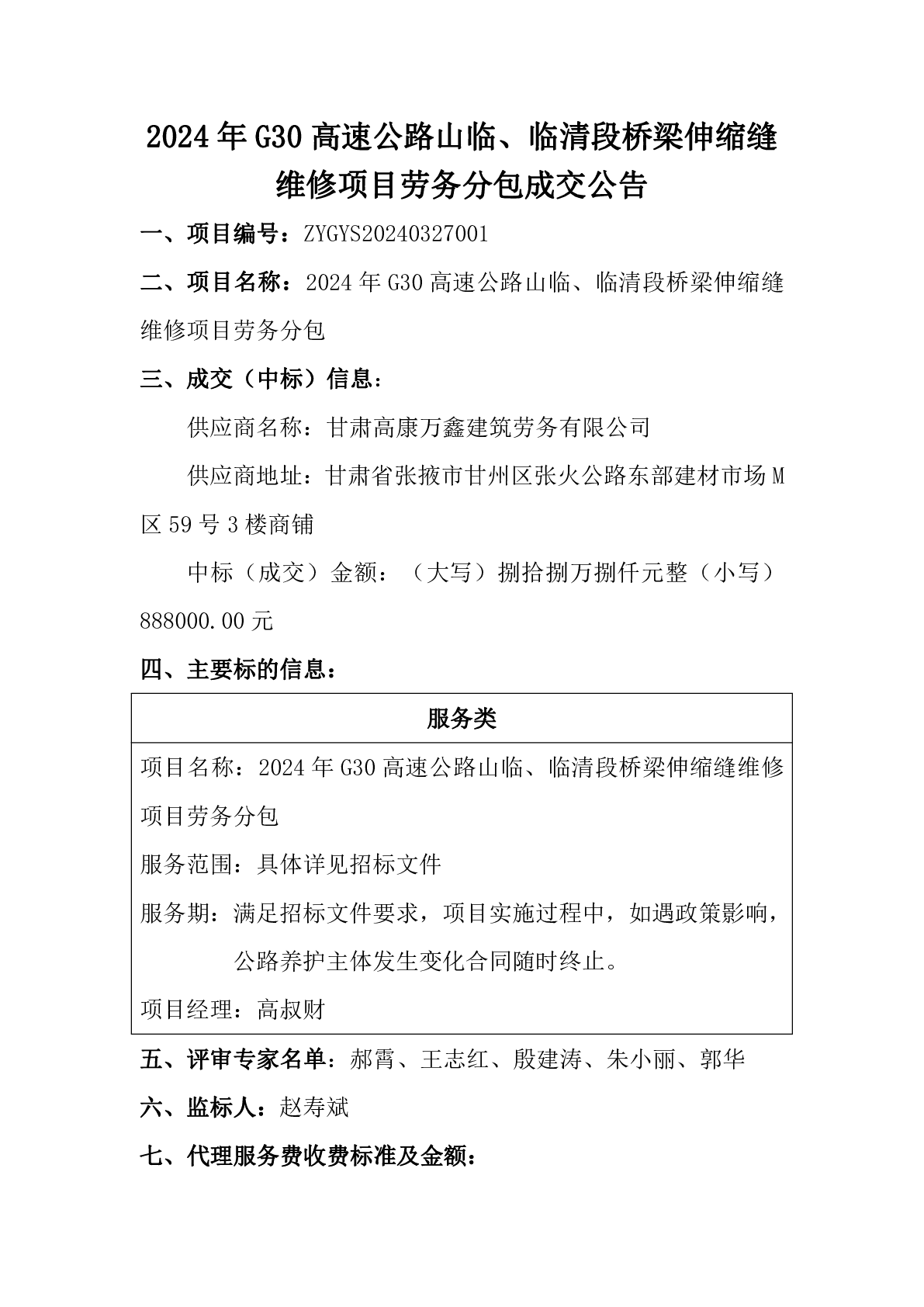 2024年G30高速公路山临、临清段桥梁伸缩缝维修项目劳务分包成交公告