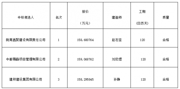 成县2023年高标准农田建设项目(沙坝镇、店村镇)补充工程于2024年4月22日在陇南兴捷工程咨询有限公司公开招标,按招标文件规定的评标方法,已确定中标候选人,现将结果公示如下:
