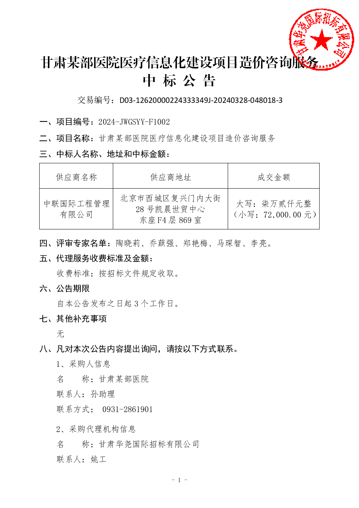 甘肃某部医院医疗信息化建设项目造价咨询服务中标公告