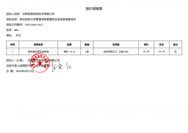 甘肃华建工程管理有限公司受西北民族大学的委托,对“西北民族大学管理学院管理综合实验室续建项目”以公开招标的方式进行采购,评标小组于2024年4月23日确定中标结果。现将中标结果公布如下: