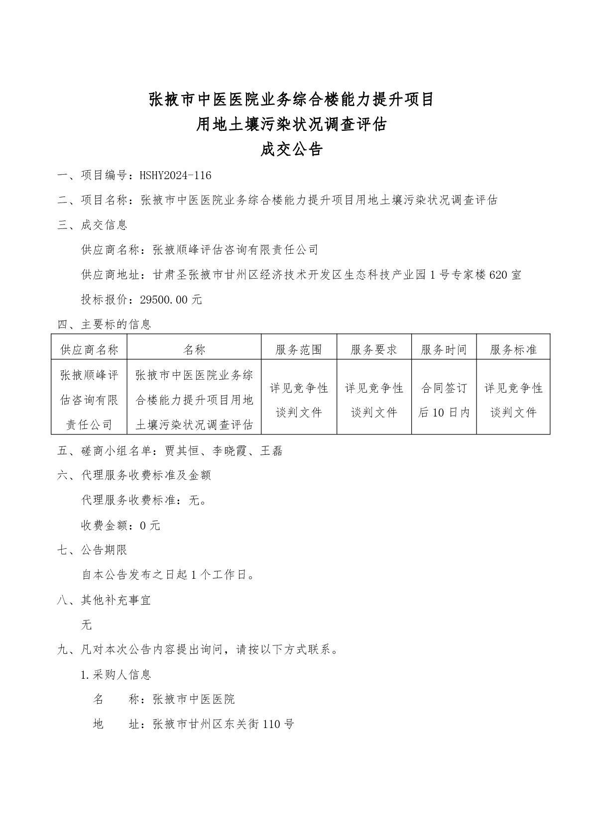 张掖市中医医院业务综合楼能力提升项目用地土壤污染状况调查评估成交公告