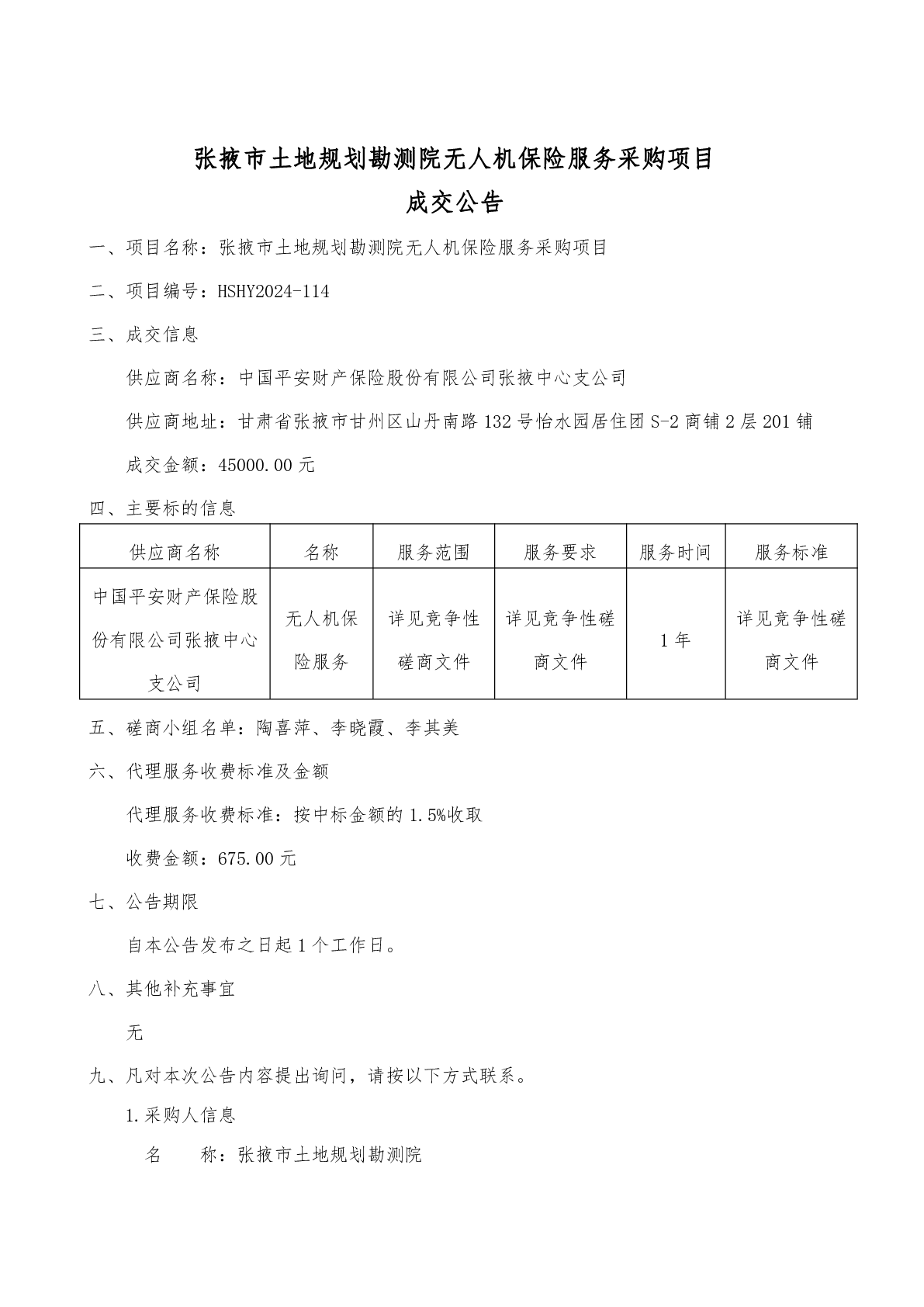 张掖市土地规划勘测院无人机保险服务采购项目成交公告