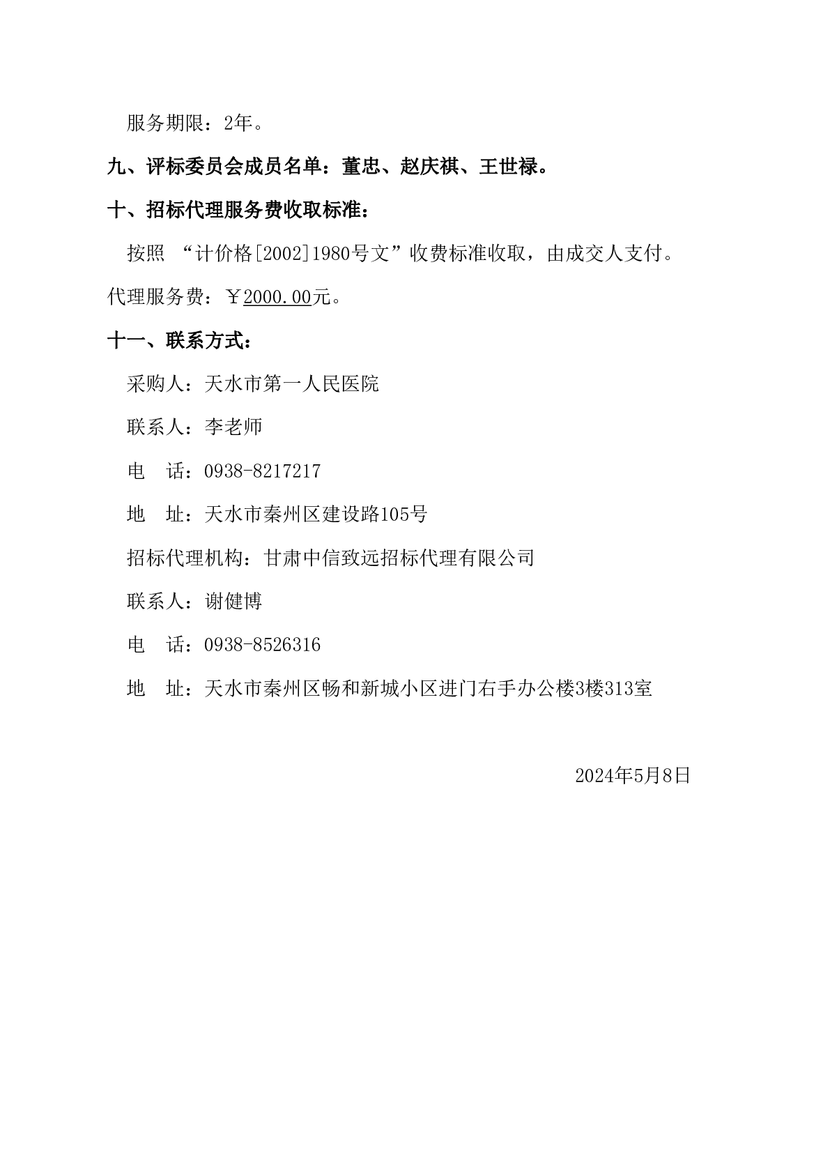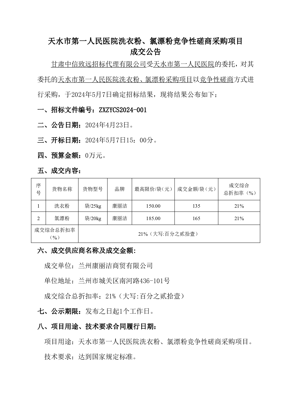 天水市第一人民医院洗衣粉、氯漂粉竞争性磋商采购项目成交公告