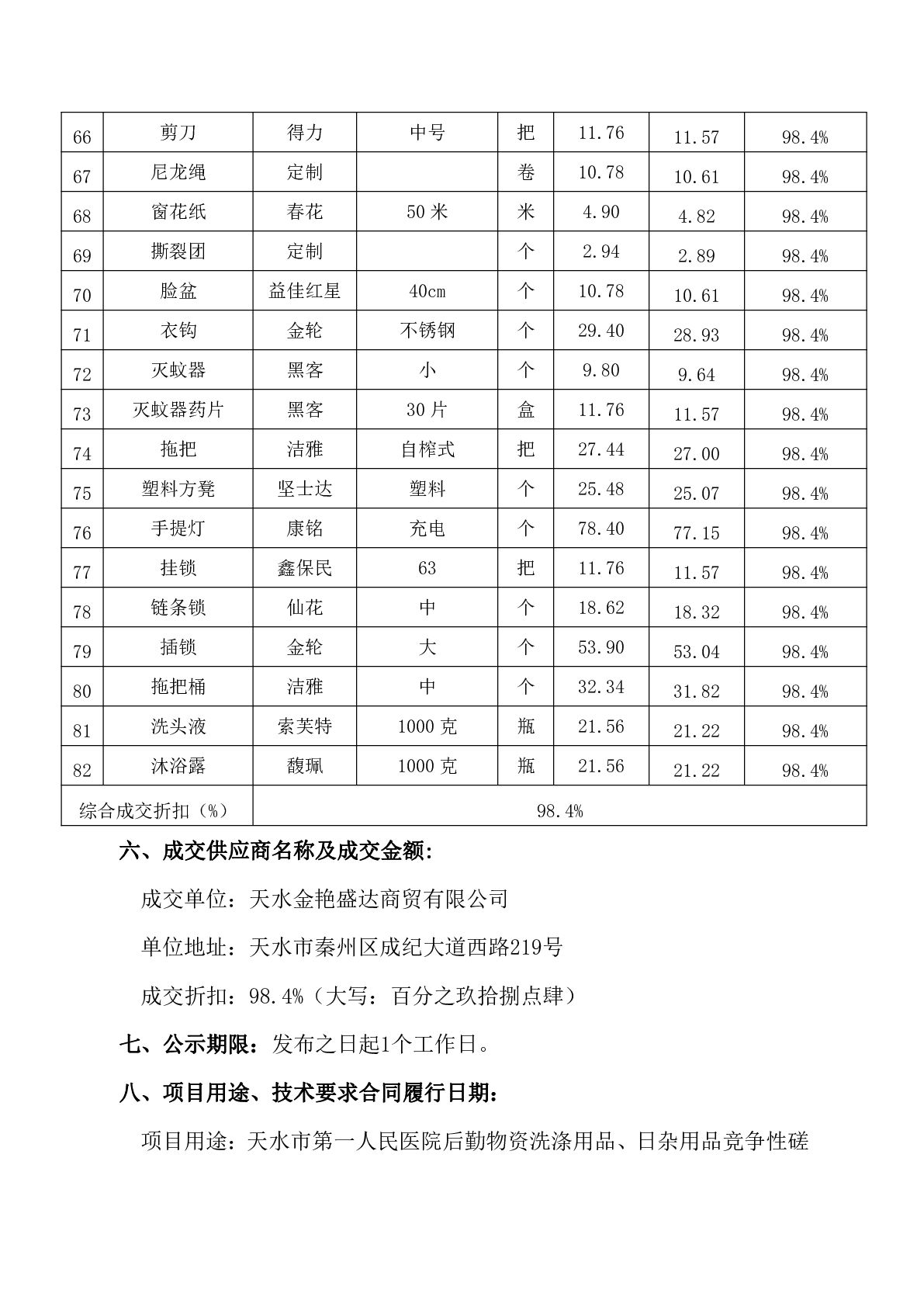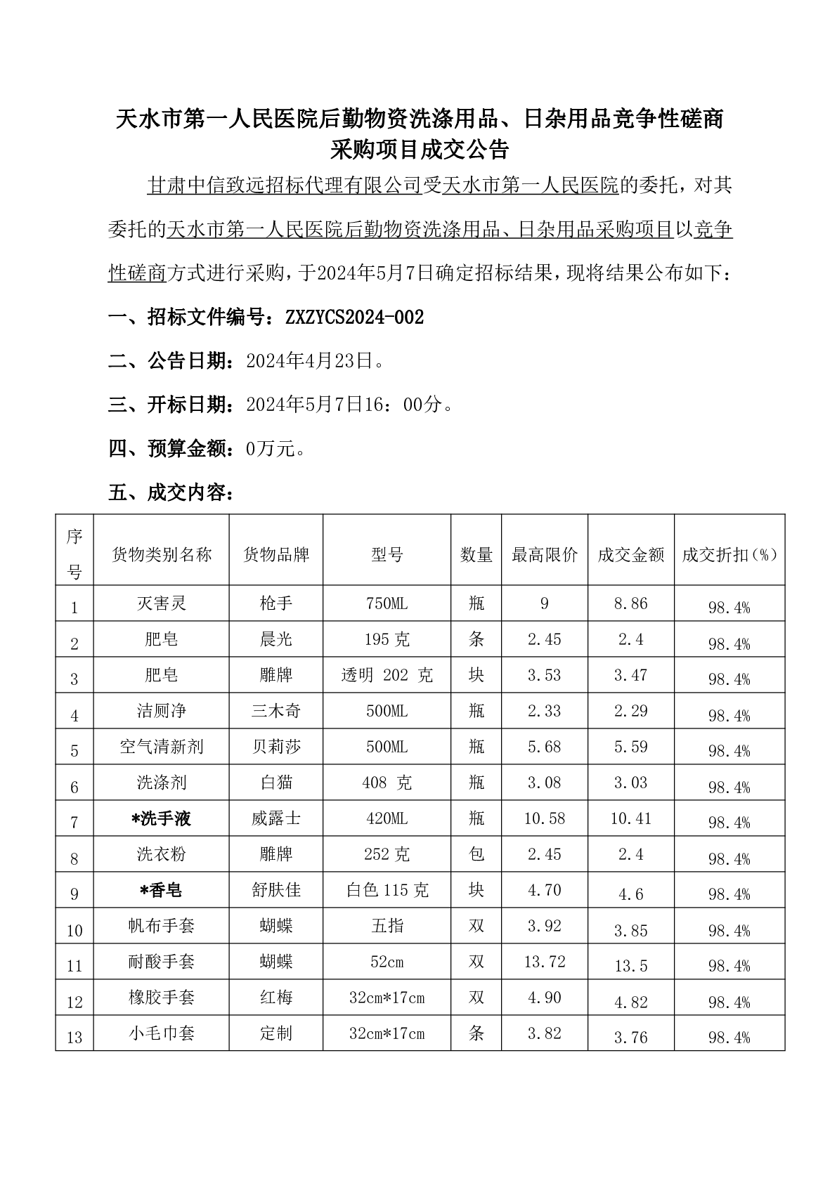 天水市第一人民医院后勤物资洗涤用品、日杂用品竞争性磋商采购项目成交公告