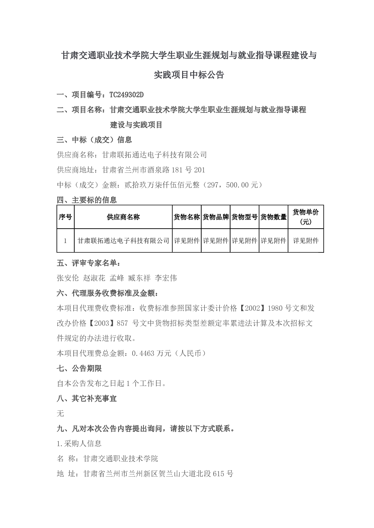 甘肃交通职业技术学院大学生职业生涯规划与就业指导课程建设与实践项目中标公告