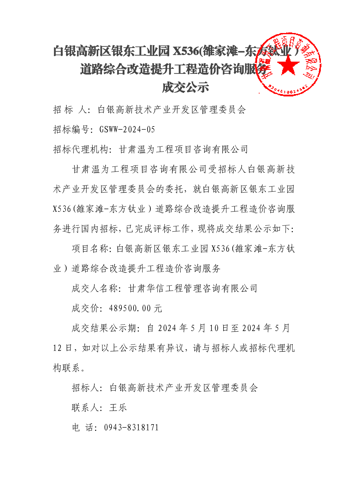 白银高新区银东工业园 X536(雒家滩-东方钛业) 道路综合改造提升工程造价咨询服务