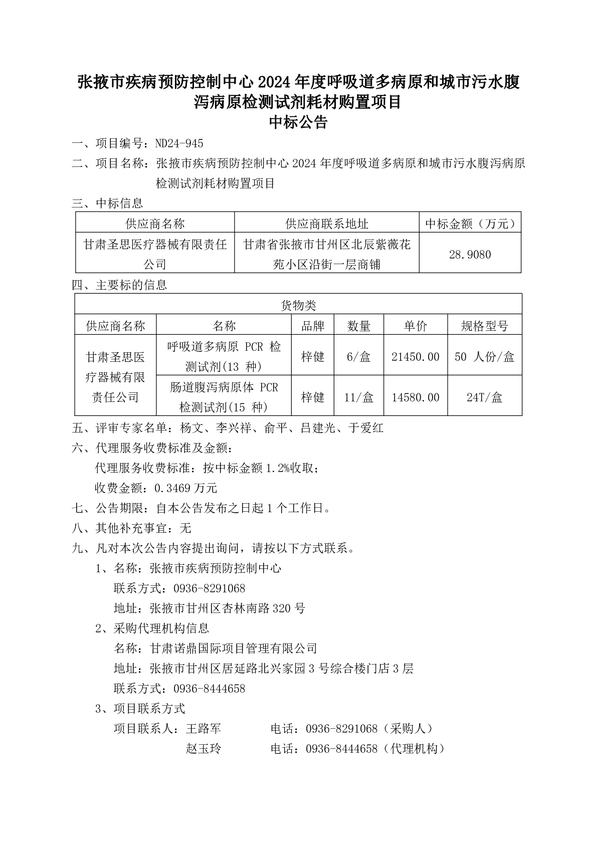 张掖市疾病预防控制中心2024年度呼吸道多病原和城市污水腹泻病原检测试剂耗材购置项目中标公告