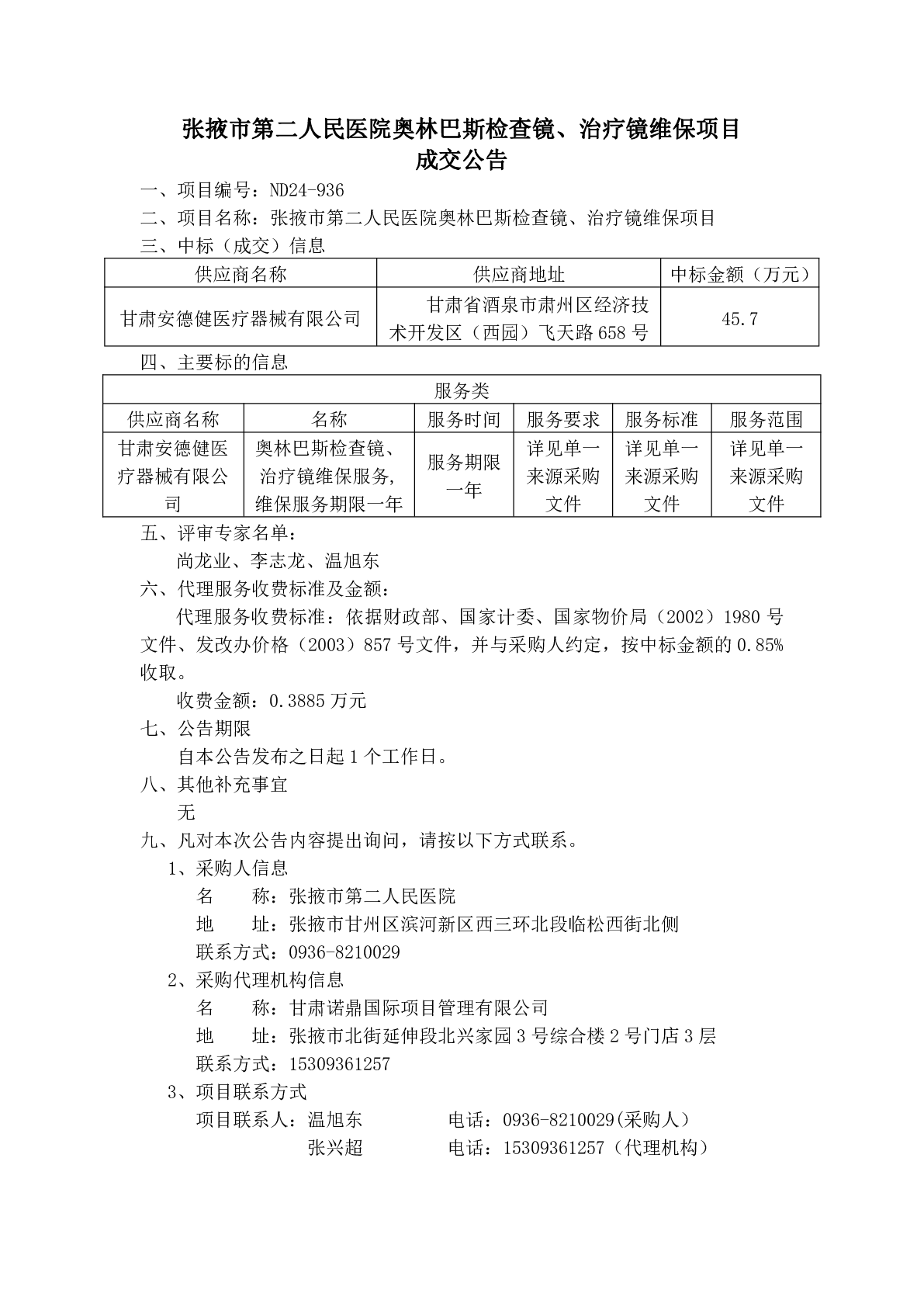 张掖市第二人民医院奥林巴斯检查镜、治疗镜维保项目成交公告
