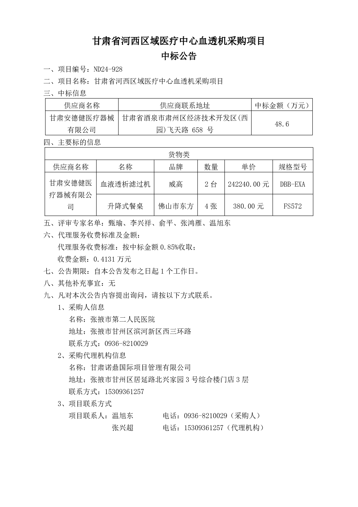甘肃省河西区域医疗中心血透机采购项目中标公告