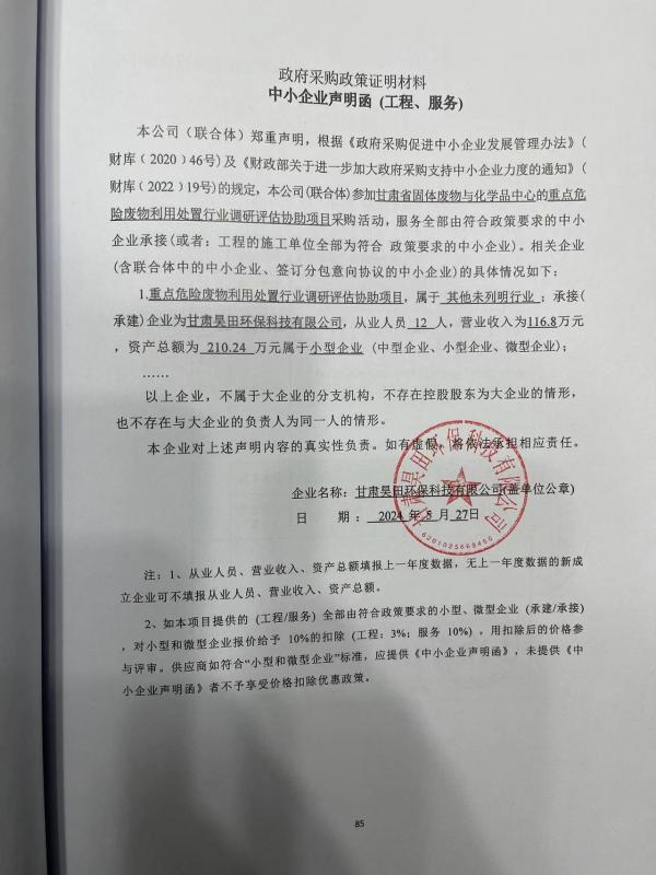 联合体牵头人:生态环境部固体废物与化学品管理技术中心 联合体成员:甘肃昊田环保科技有限公司 | 重点危险废物利用处置行业调研评估协助项目 | 详见附件及磋商文件 | 详见附件及磋商文件 | 详见附件及磋商文件 | 详见附件及磋商文件 |