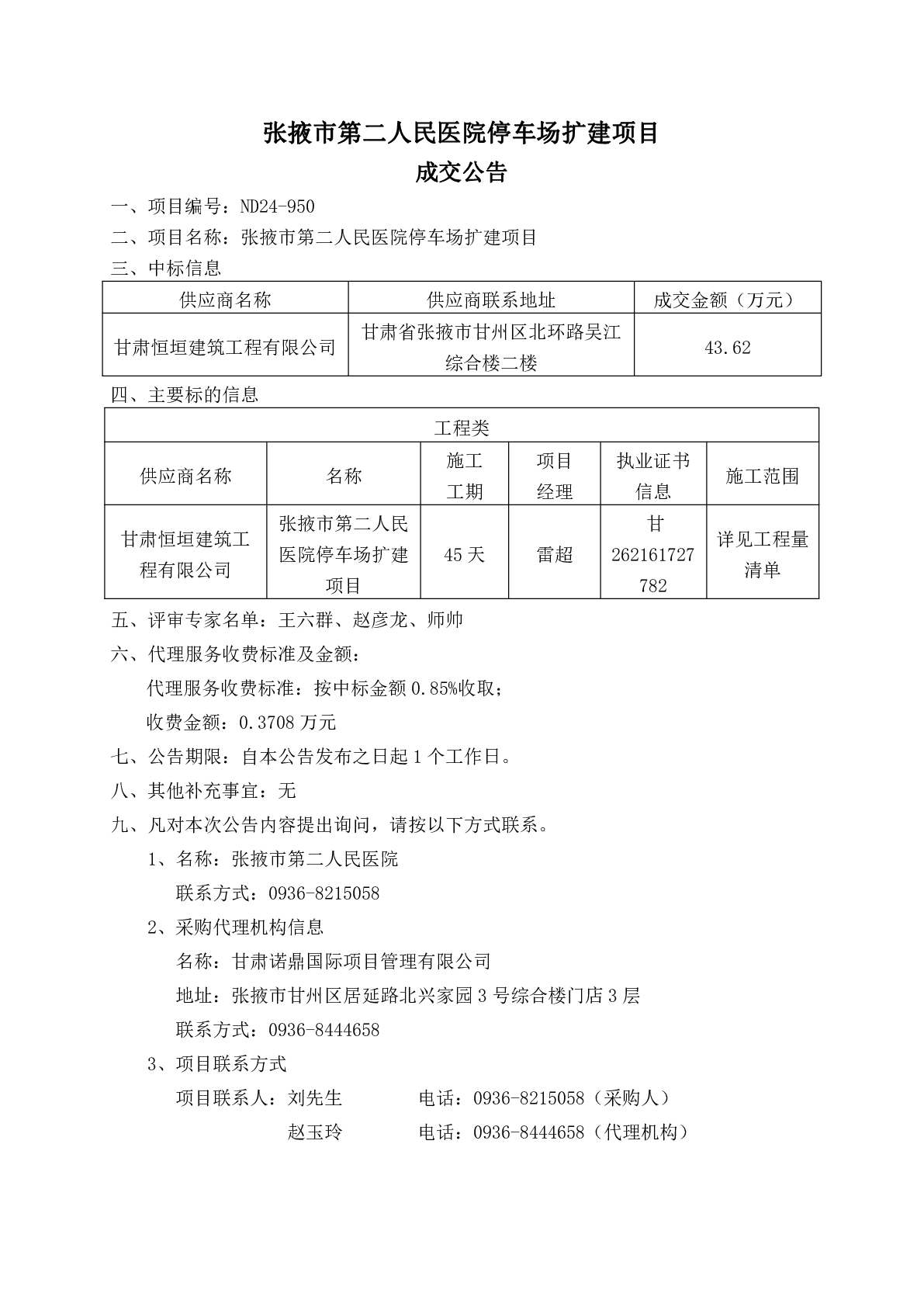 张掖市第二人民医院停车场扩建项目成交公告