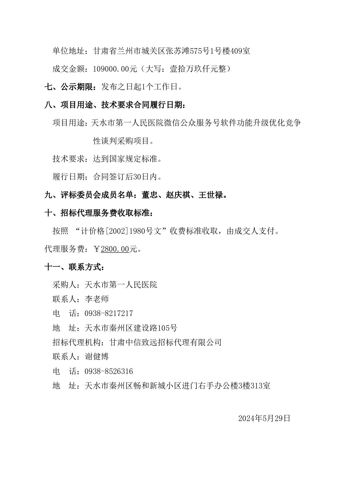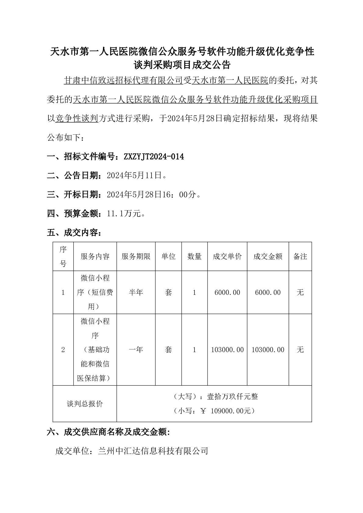 天水市第一人民医院微信公众服务号软件功能升级优化竞争性谈判采购项目成交公告