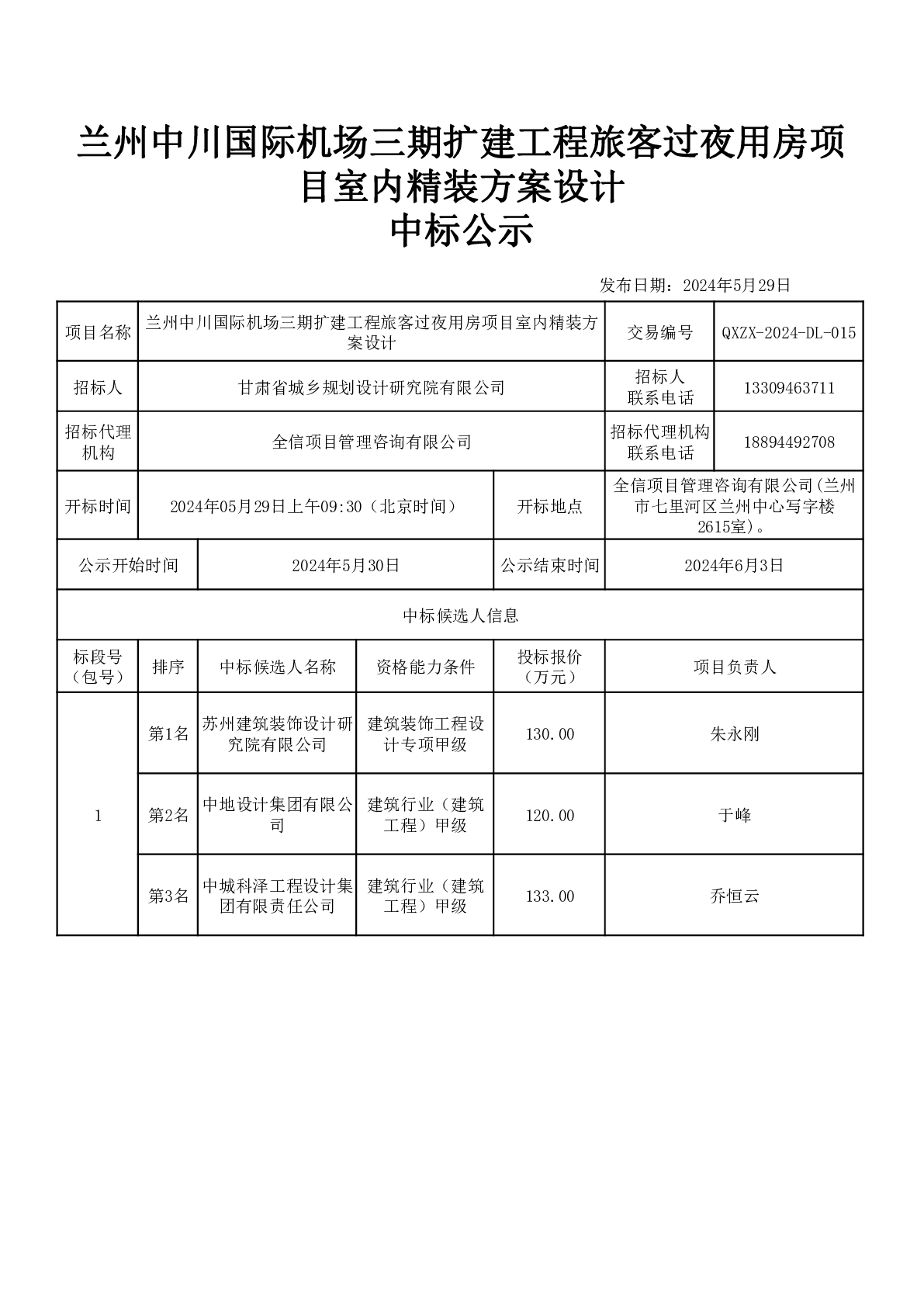 兰州中川国际机场三期扩建工程旅客过夜用房项目室内精装方案设计 中标公示