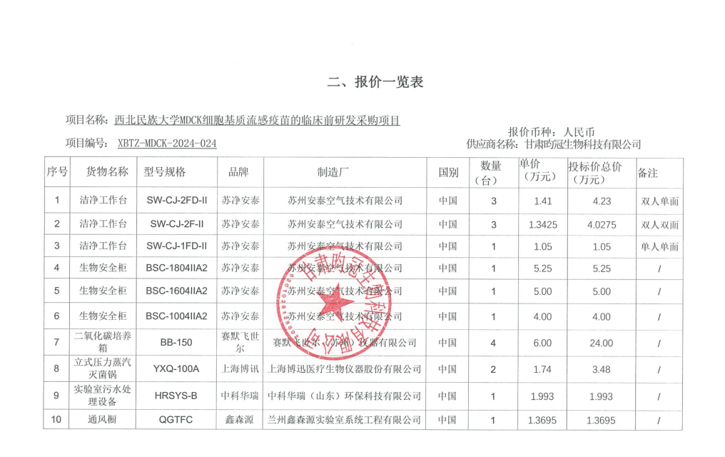兰州西部投资咨询有限公司受西北民族大学的委托,对西北民族大学MDCK细胞基质流感疫苗的临床前研发采购项目以公开招标的方式进行采购,评标委员会于2024年5月30日确定中标结果。现将中标结果公布如下: