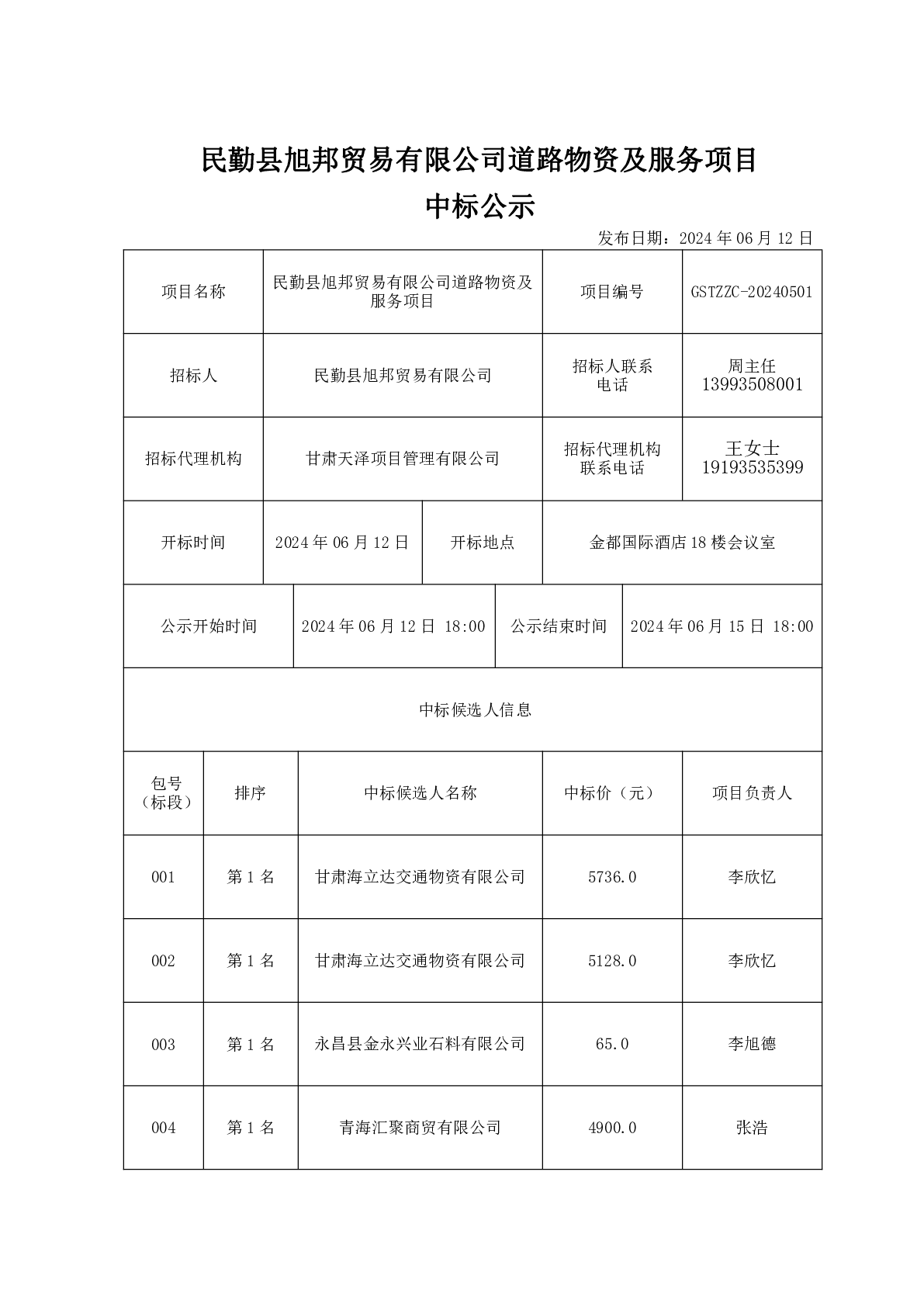 民勤县旭邦贸易有限公司道路物资及服务项目