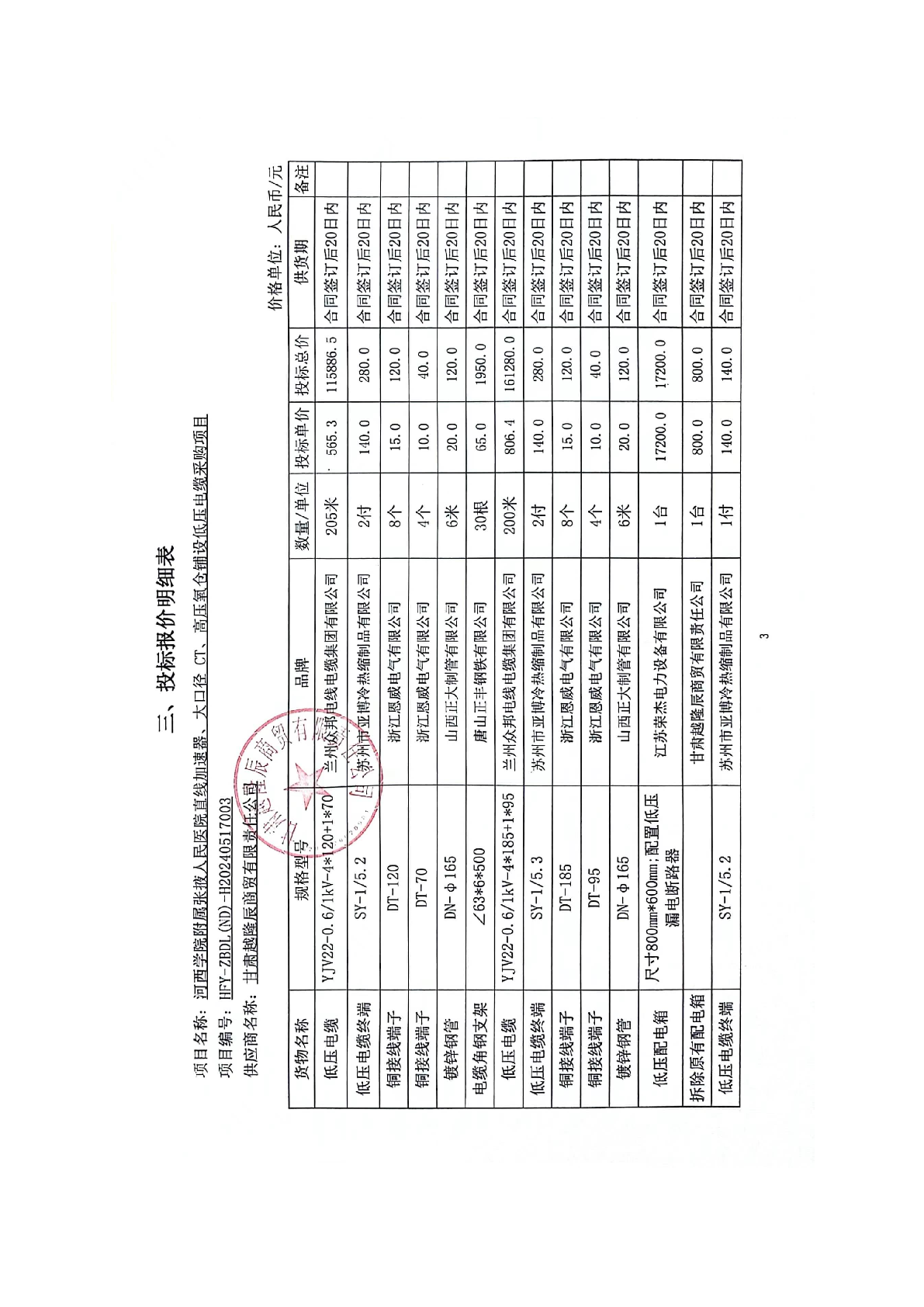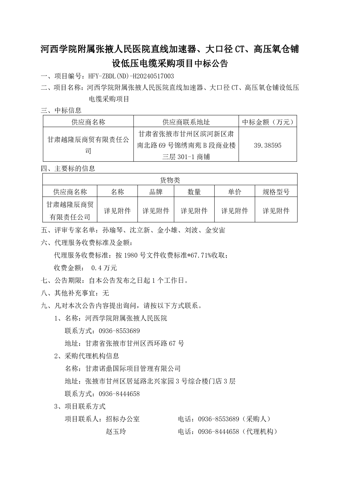 河西学院附属张掖人民医院直线加速器、大口径CT、高压氧仓铺设低压电缆采购项目中标公告