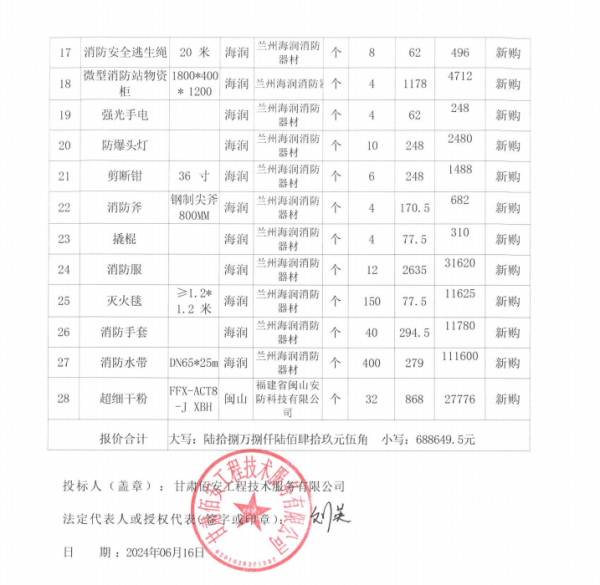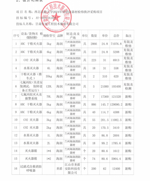 甘肃安宇工程造价咨询有限公司受西北民族大学的委托,对“西北民族大学2024年度消防器材检修换充及采购项目”以公开招标的方式进行采购,评审小组于2024年6月18日确定中标结果。现将中标结果公布如下: