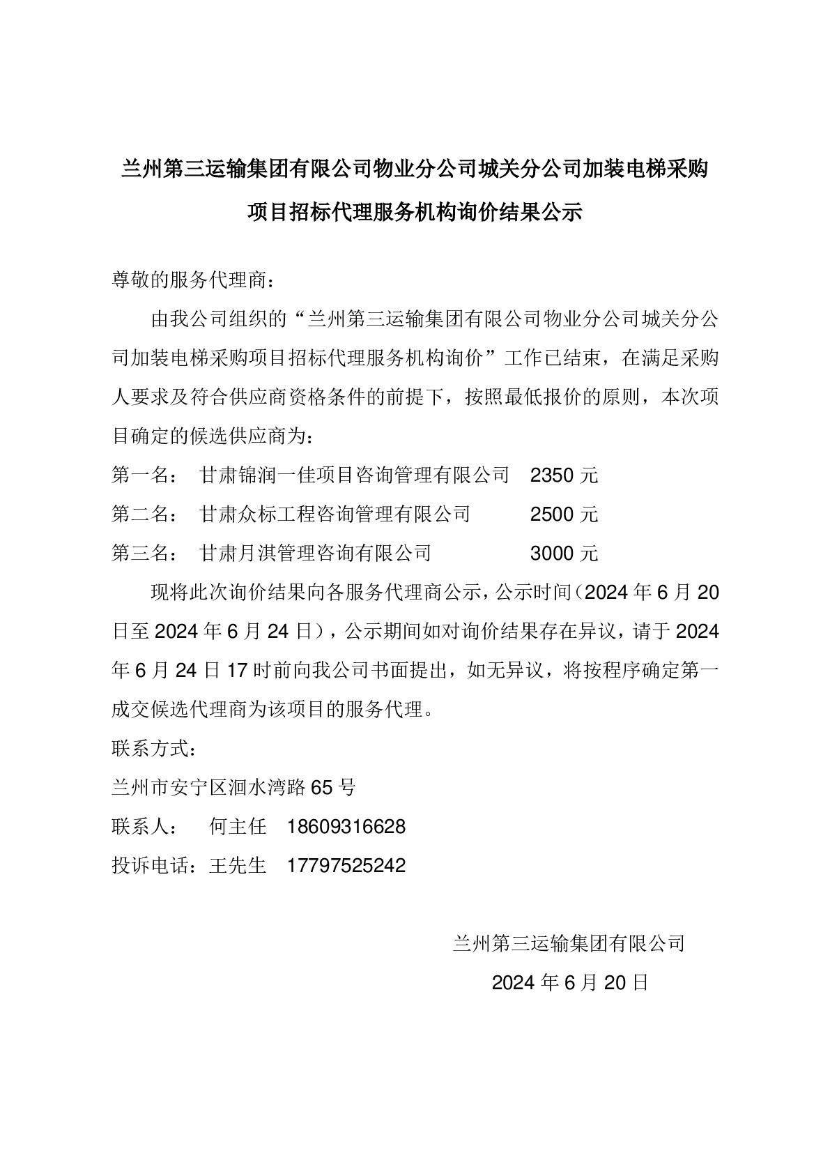 兰州第三运输集团有限公司物业分公司城关分公司加装电梯采购项目招标代理服务机构询价结果公示