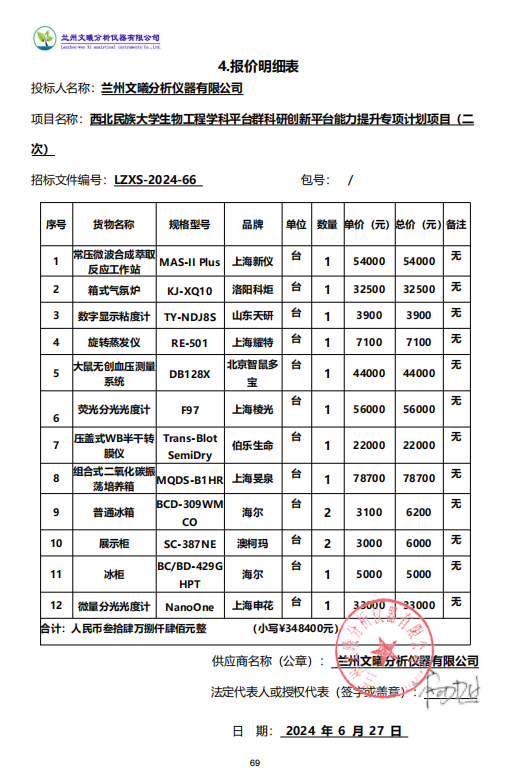 1 | 西北民族大学生物工程学科平台群科研创新平台能力提升专项计划项目(二次) | 兰州文曦分析仪器有限公司 | 兰州市城关区科技街95号 | 34.84 |