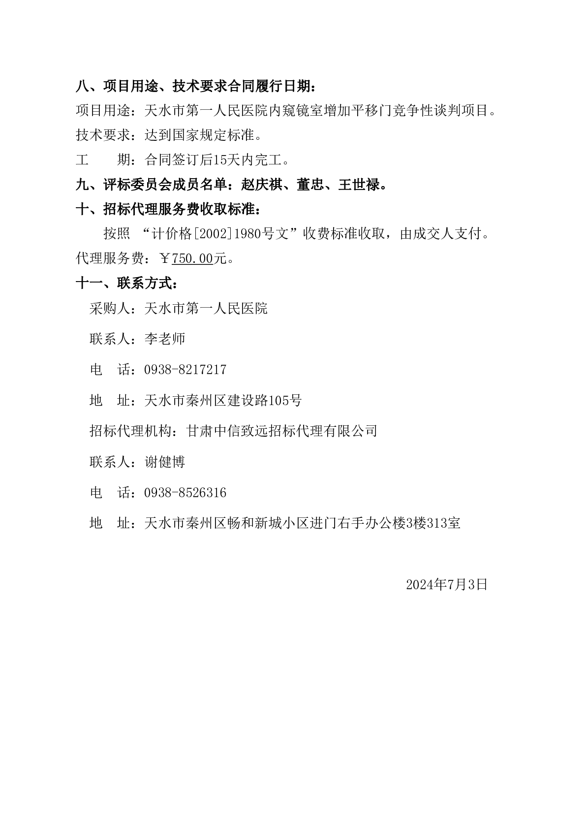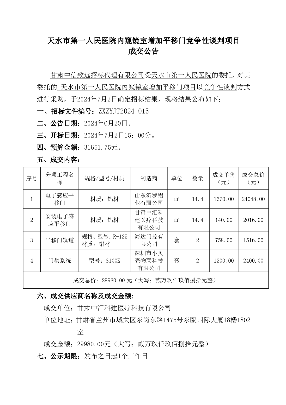 天水市第一人民医院内窥镜室增加平移门竞争性谈判项目成交公告